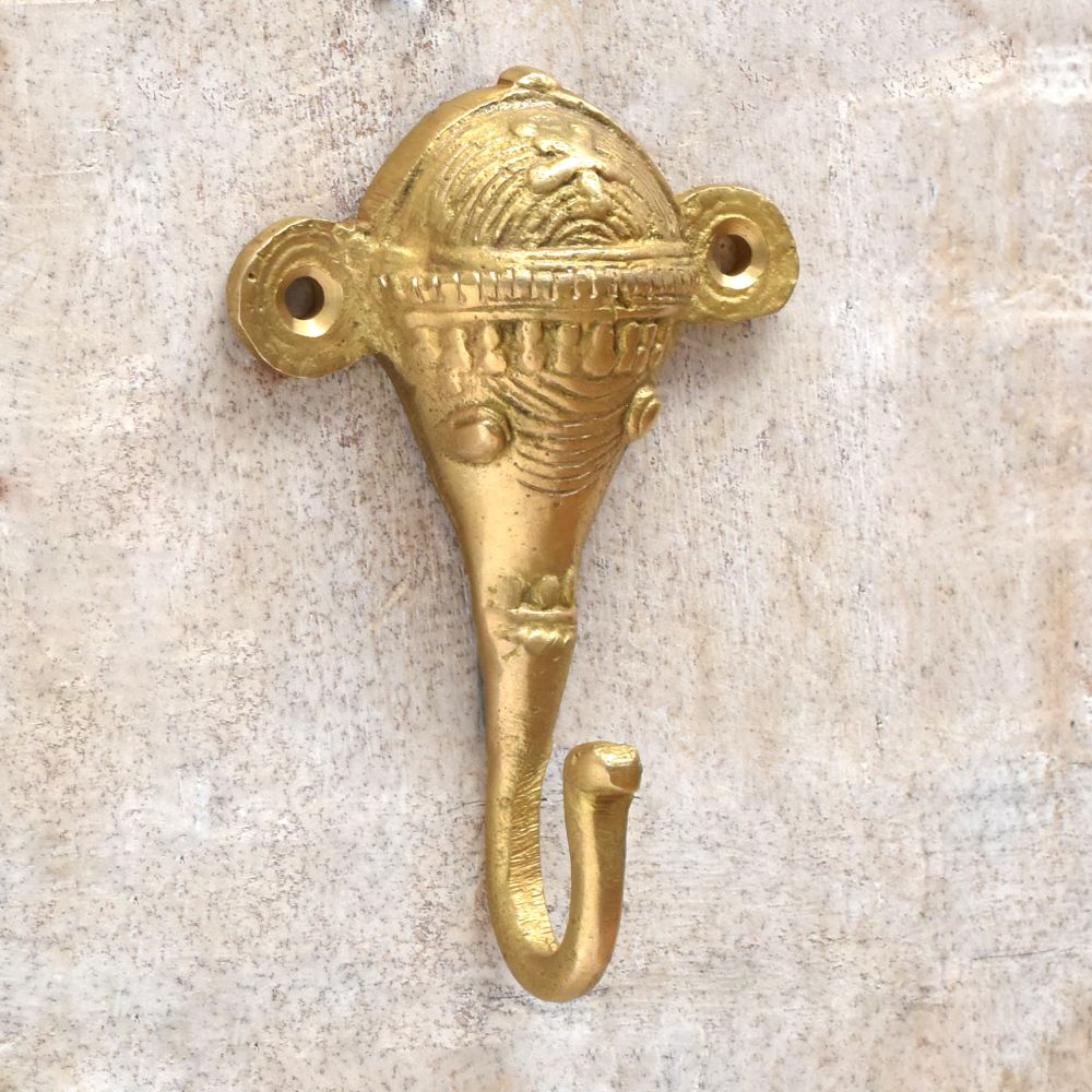 Add a royal touch to your décor with the Golden Brass Elephant Face Wall Hook. Handcrafted from solid brass, this elegant wall hook features a beautifully sculpted elephant face—an iconic symbol of wisdom, strength, and good fortune in Indian culture. The golden finish enhances its regal look, making it both a practical accessory and a striking statement piece. Ideal for entryways, bedrooms, or living spaces, this hook brings together utility and cultural artistry in one timeless piece.