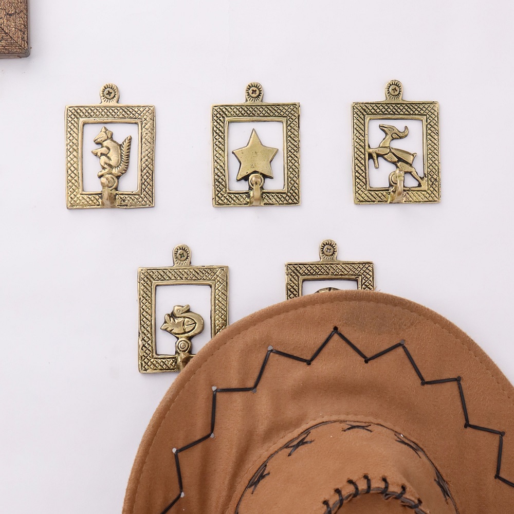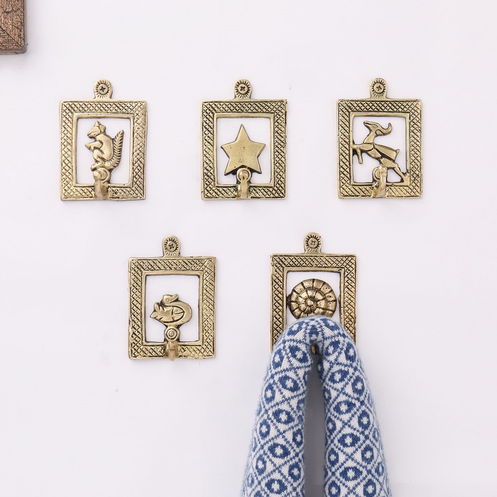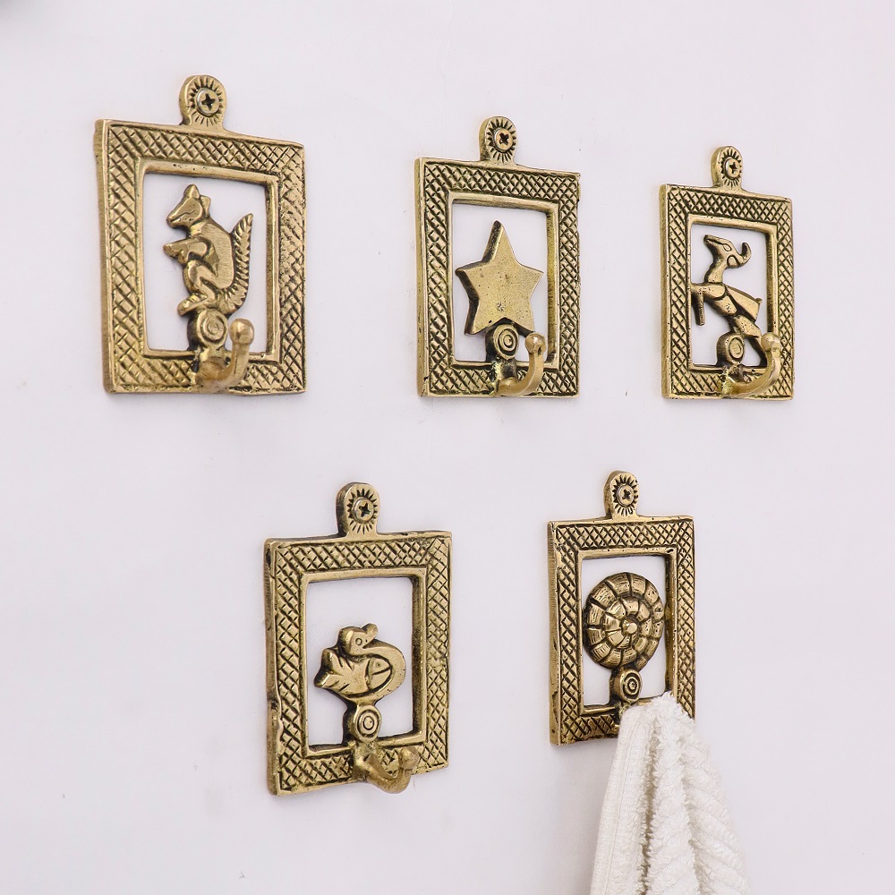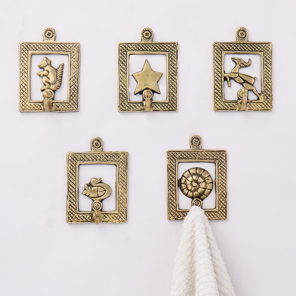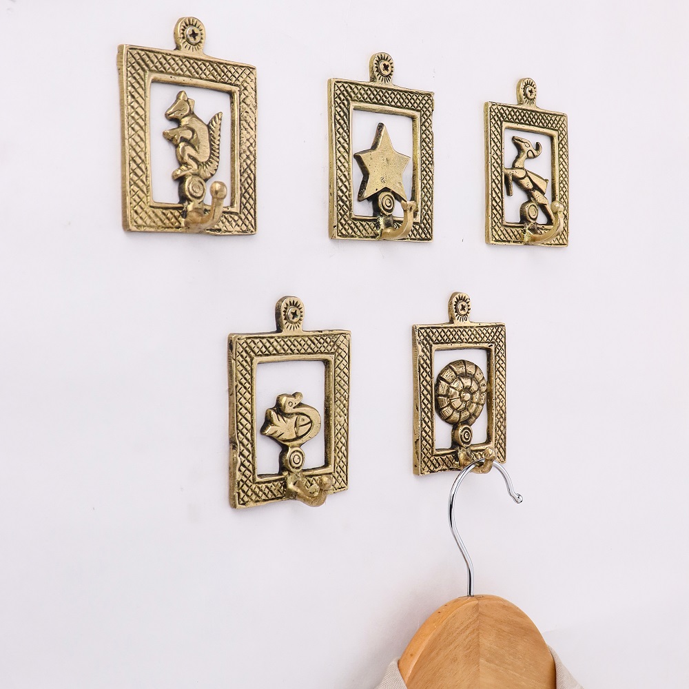 Golden Brass Framed Design Single Wall Hooks Set of 5. This Hooks is Strong Enough to Hold Your Cloths, Keys, Tea Cups, Coffee Mugs, Hand Towels Etc.
