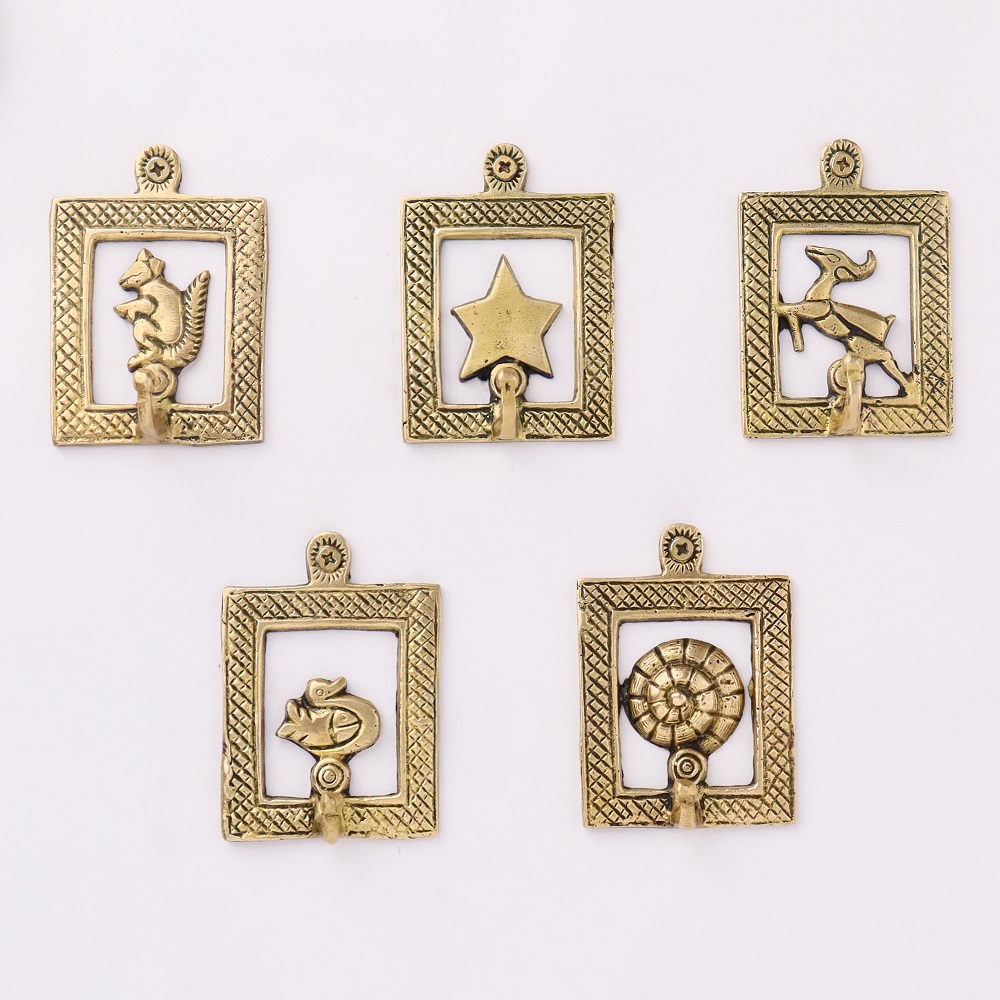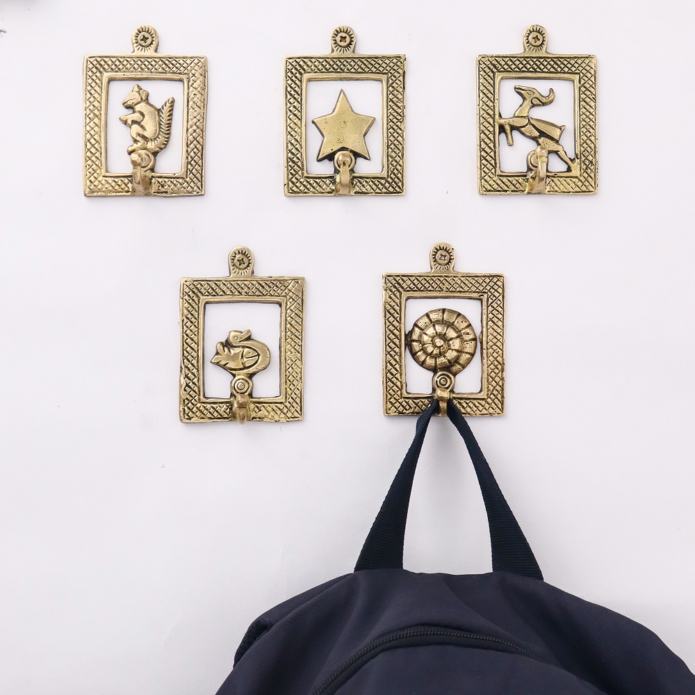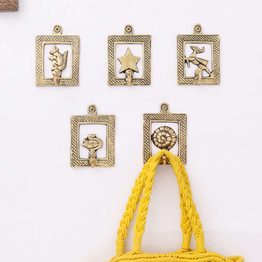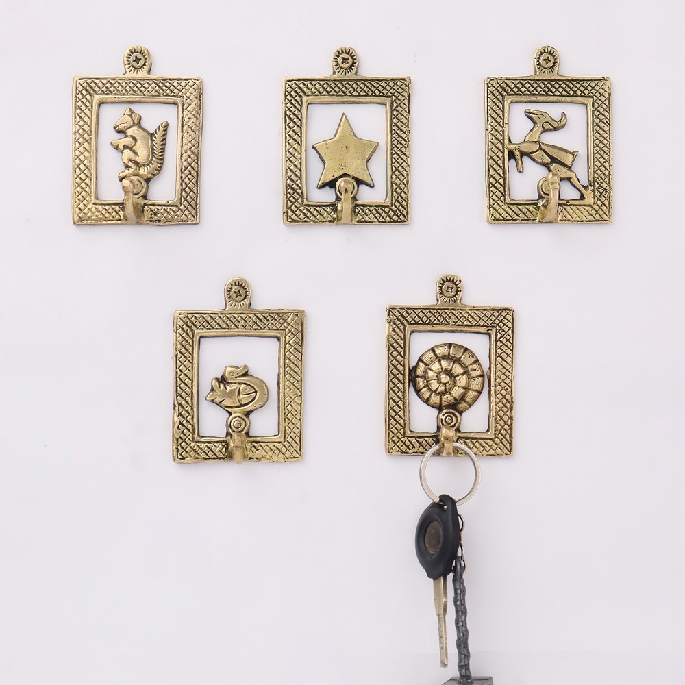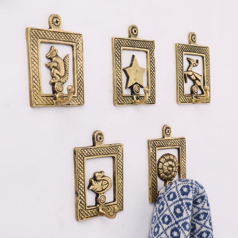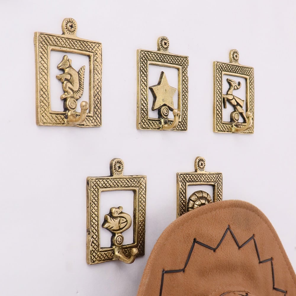 Golden Brass Framed Design Single Wall Hooks Set of 5. This Hooks is Strong Enough to Hold Your Cloths, Keys, Tea Cups, Coffee Mugs, Hand Towels Etc.