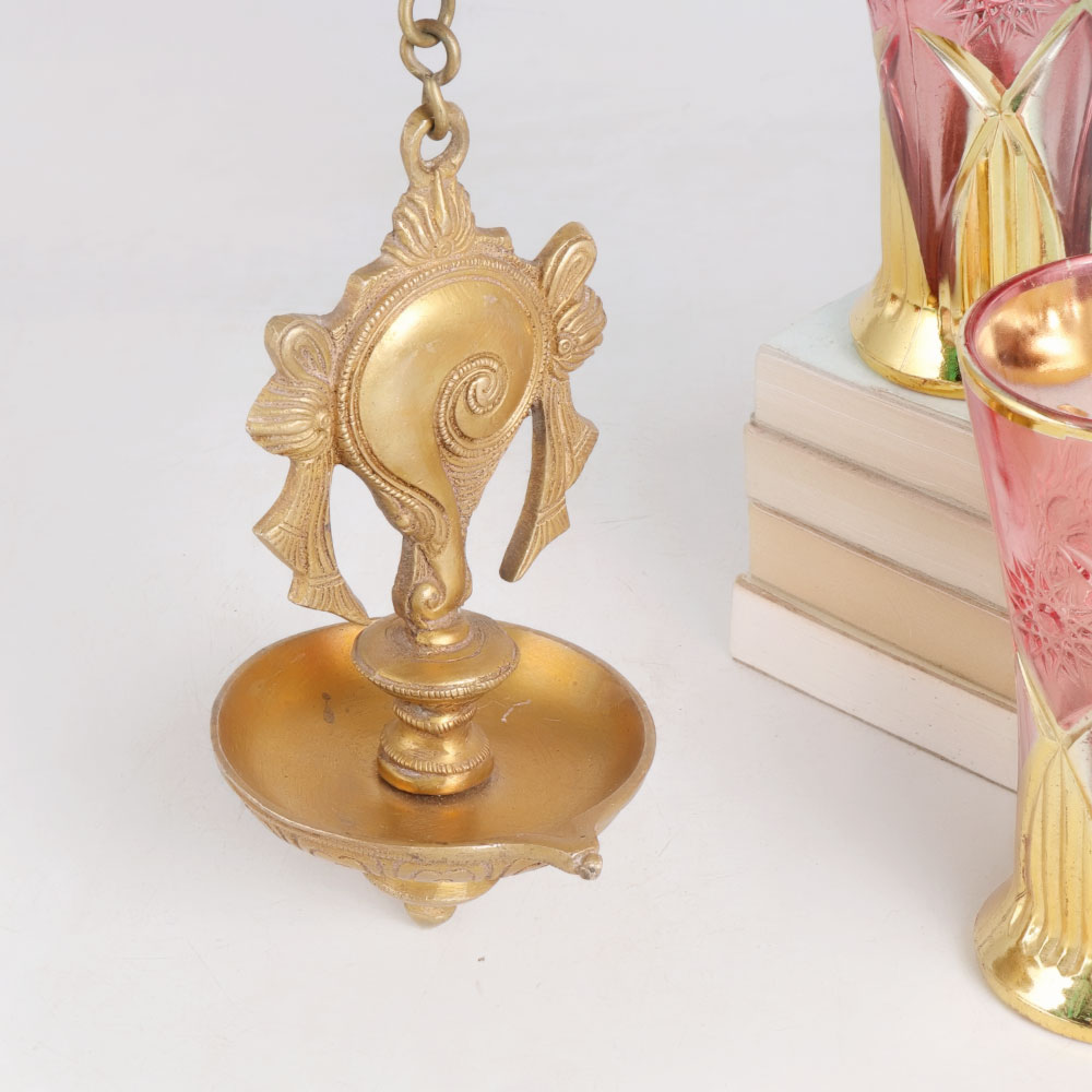 Hanging oil lamp made of brass with a golden finish that suits all interiors and gives an aesthetic look. It has a unique design with a chain to hang it in the prayer room at home or in the office or temple. It is handcrafted by skilled Indian artisans and adds a remarkable impression to the interior. Use this auspicious lamp to spread positive flair in your environment. It can be used with mustard oil or ghee and a cotton wick. This brass oil lamp is often used in temples for worship. Since it is made of high quality brass, it is an ideal gift for your family, friends and relatives on special, festive and auspicious occasions to make them feel special.