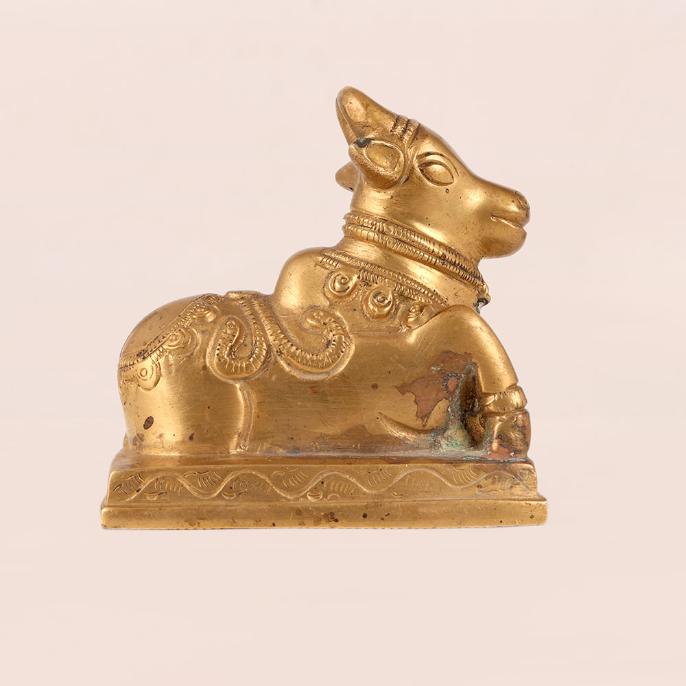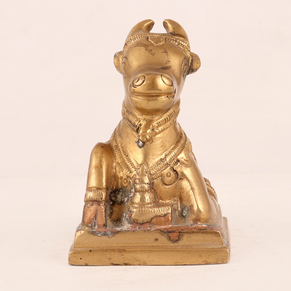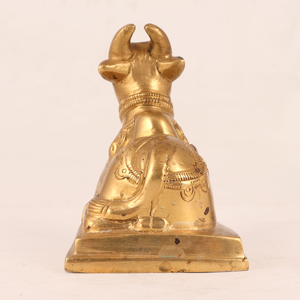 Buy a brass statue of Lord Nandi online that is exquisitely crafted by highly skilled Indian artisans in the revered South Indian Art tradition. This magnificent piece showcases the sacred bull in a seated posture upon a meticulously detailed platform, bathed in an alluring antique golden finish. Lord Nandi, the divine vehicle and devoted companion of Lord Shiva, is revered in Hindu mythology for his unwavering loyalty and wisdom. This statue embodies his grace and majesty, making it an ideal addition to your home, office, restaurant, hotel, cafe, or shop's prayer room. It serves as both a symbol of devotion and a striking decorative element. This remarkable creation isn't just a piece of art; it's a testament to craftsmanship and history. Collectors will appreciate its vintage allure, making it a precious addition to any collection. Moreover, it's an ideal gift for loved ones during special, festive, or auspicious occasions, symbolizing blessings, protection, and the enduring bond of friendship and family.
