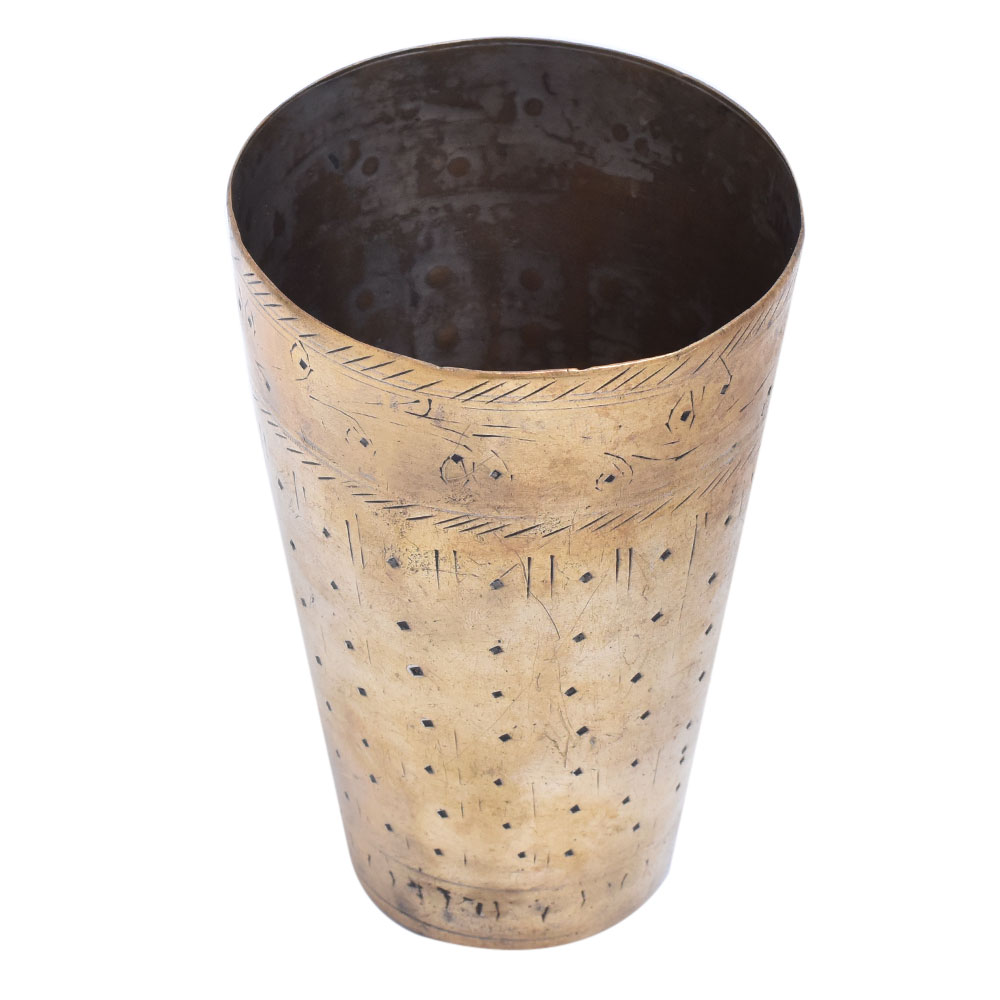 The golden brass Punjabi lassi glass faded design Serveware is a sturdy, elegant, and lovely addition to your home decor. It is frequently quickly transformed into a lovely day of remembrance, Wedding, Diwali, or Valentine gift item. Local artists then added a Midas touch to emphasize the household's importance. The wealthier the household, the heavier the glass and its designs. These are now more of a novelty item than a utensil.