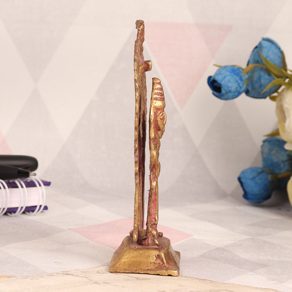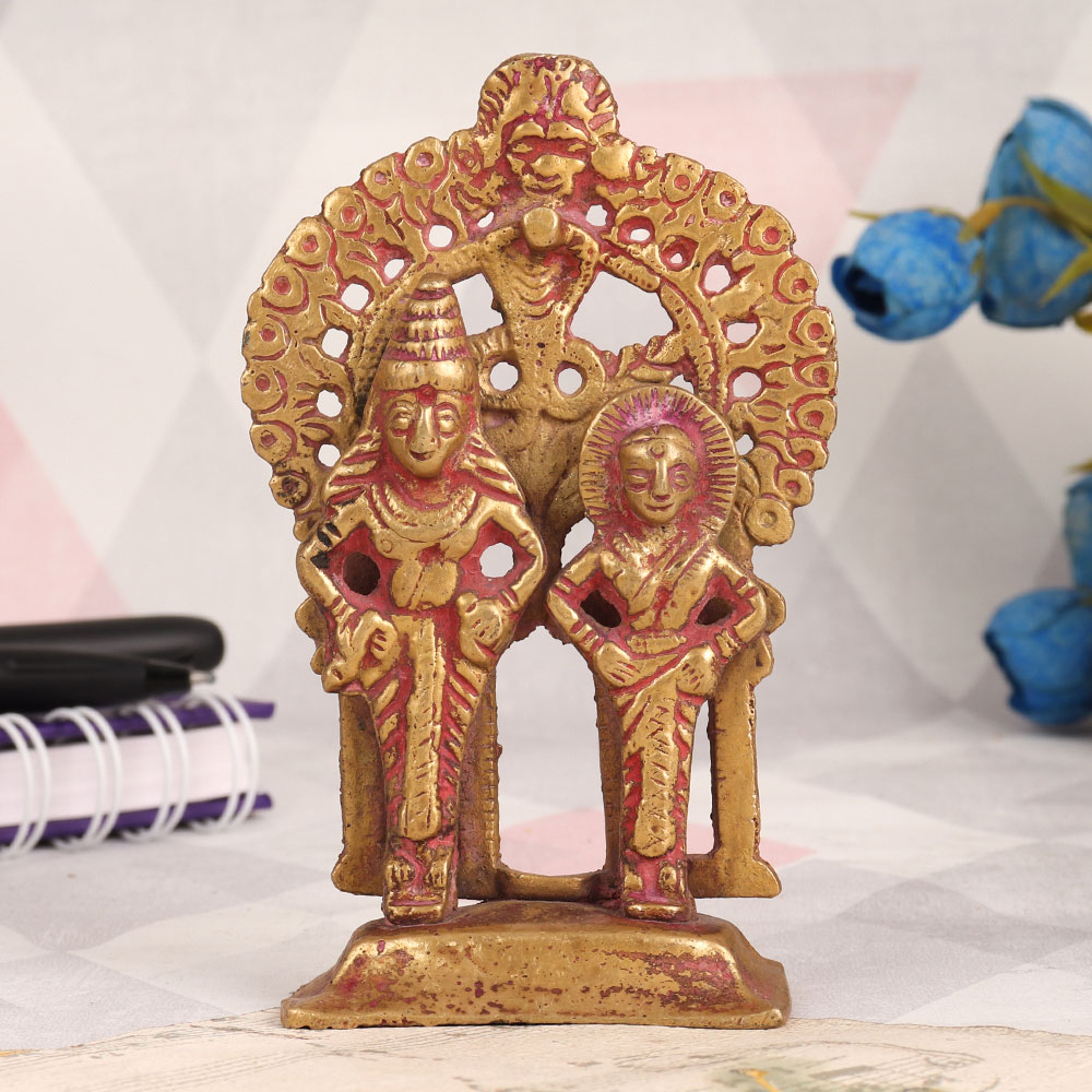Add a touch of divine elegance to your home, office, restaurant, hotel, or cafe with this exquisite standing brass statue of Lord Shiva and Goddess Parvati, complete with a stunning Prabhavali in an antique golden finish. Handcrafted by highly talented Indian artisans, this masterpiece is a testament to their unparalleled craftsmanship. Crafted from high-quality brass, this sculpture not only radiates timeless beauty but also captures the essence of devotion and love. It serves as a perfect centerpiece for your prayer room, invoking a sense of serenity and spirituality during worship. This magnificent piece isn't just for personal use, it's a splendid addition to any vintage collection, lending an air of antiquity and cultural richness to any space. Moreover, it's a captivating exhibit for museums or exhibitions, drawing admirers with its intricate details and historical significance. For those seeking a meaningful and thoughtful gift, this statue is an ideal choice. Present it to your loved ones on special, festive, or auspicious occasions, and share the blessings of Lord Shiva and Goddess Parvati with them.