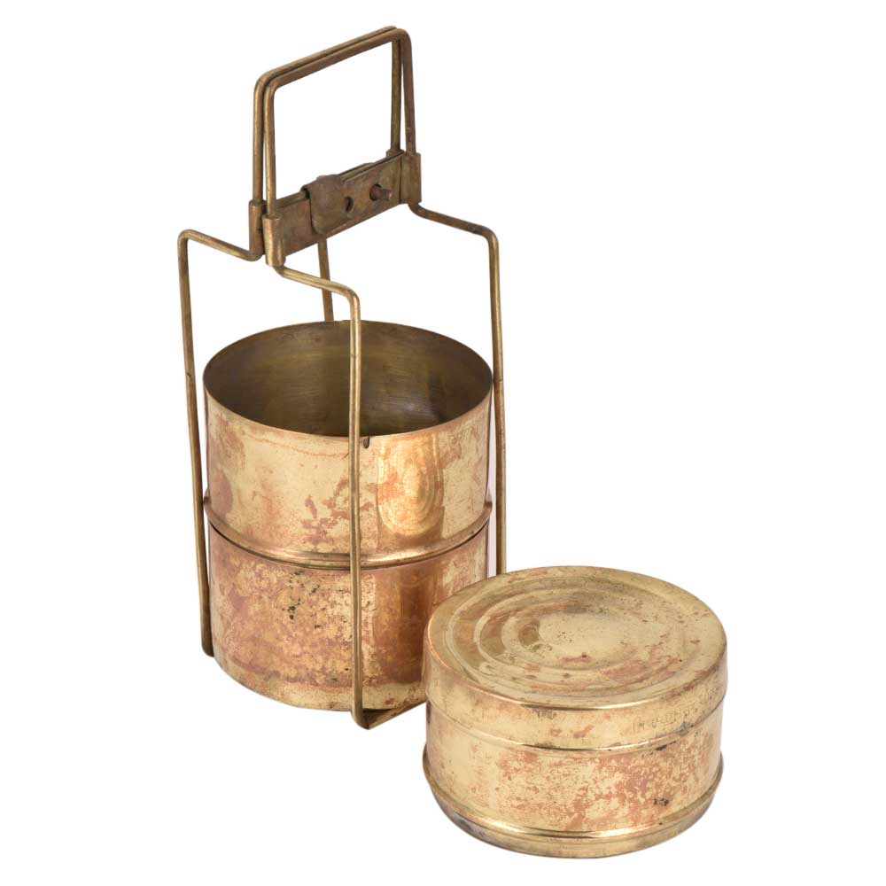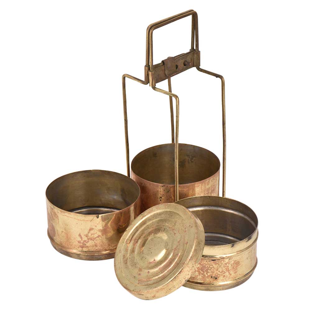 Golden brass Tiffin box with three containers held together with a thin metal frame and a lock . It was originally used to transport lunch from one place to another it is now used for home decoration on the table, kitchen shelf, hotels , restaurants, for presentation of food by food bloggers, gift for near and dear ones.