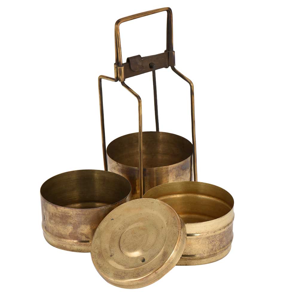 • Golden Brass Tiffin Box Three Container Thin Brass Strap And Lock