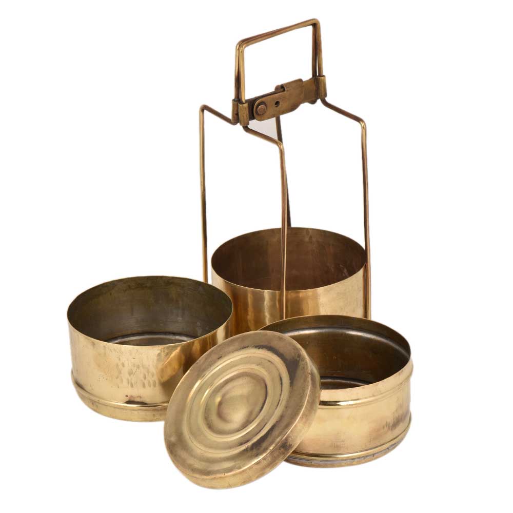 • Golden Brass Tiffin Box With Three Compartments With Traditional Lock