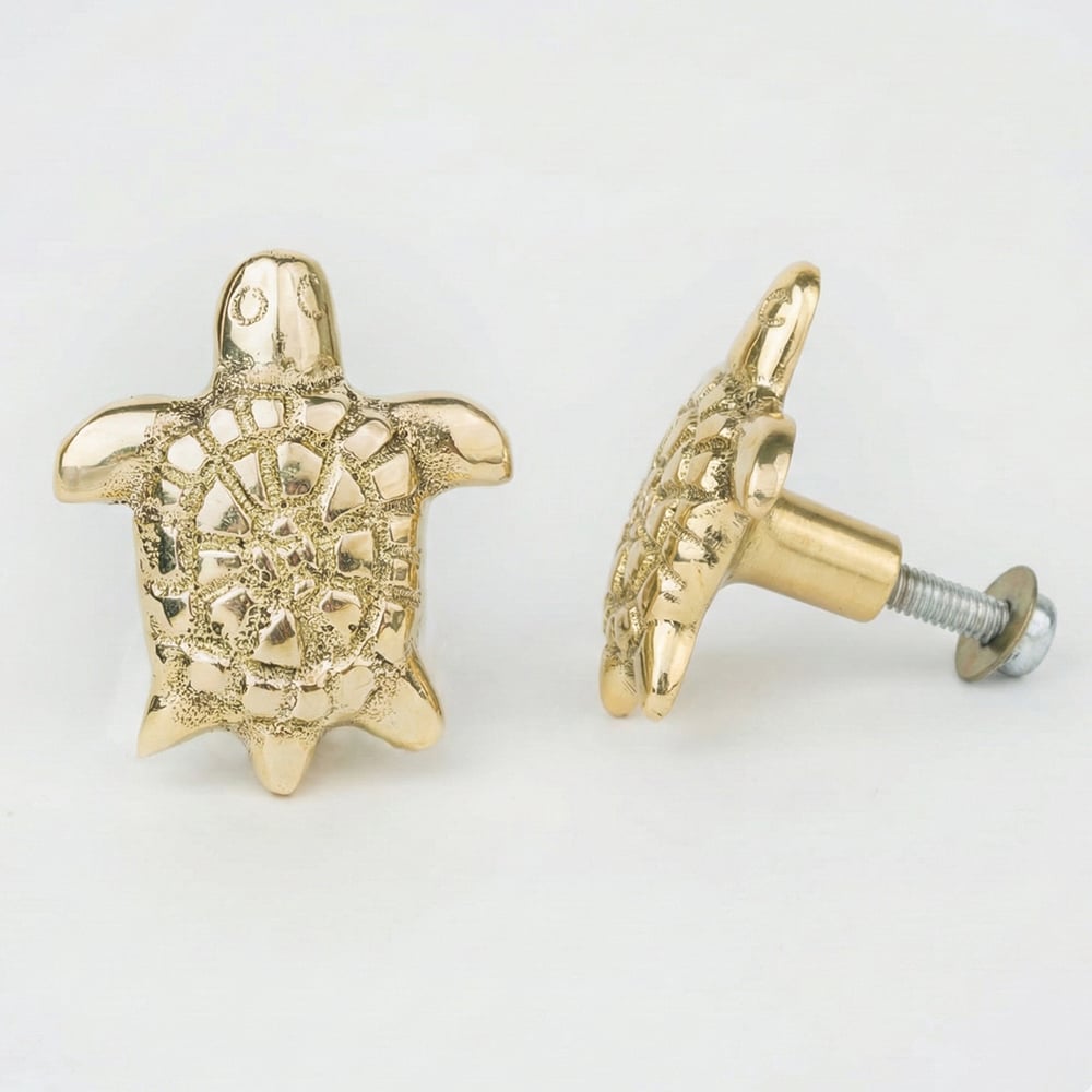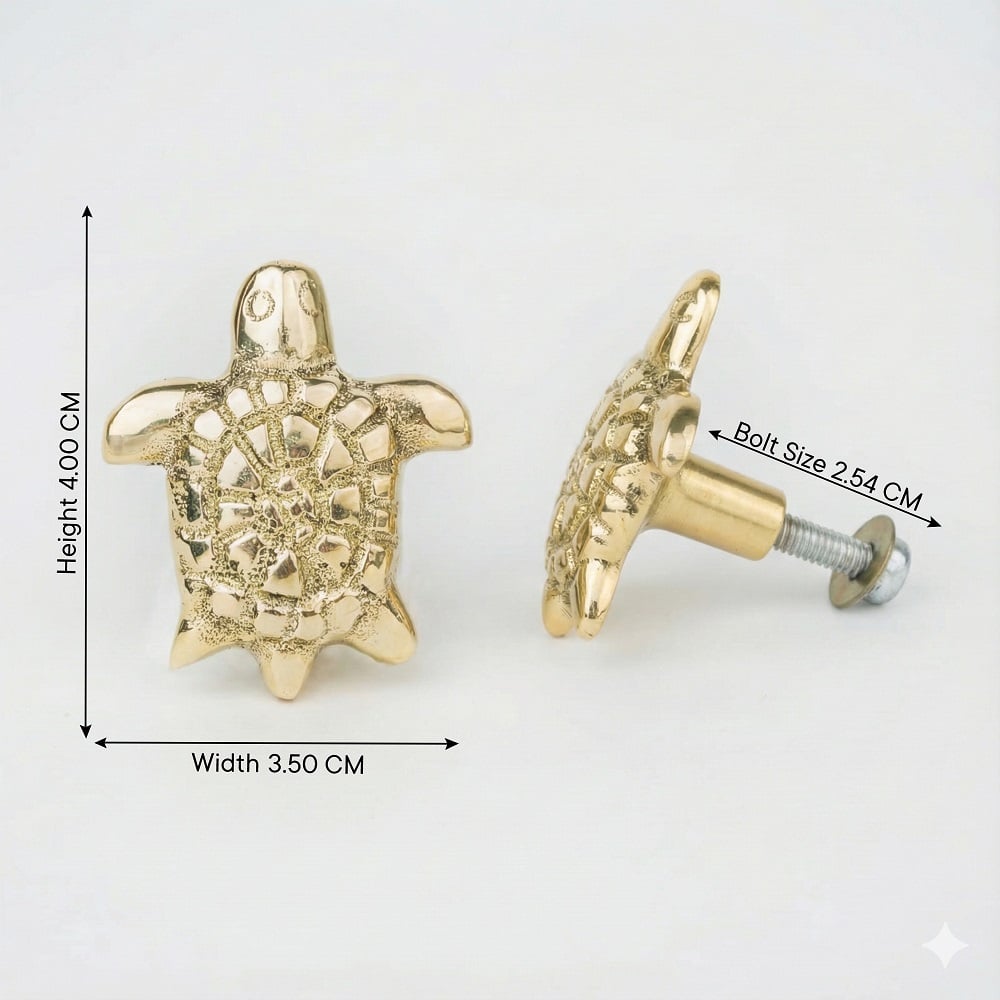 Bring a touch of luxury and symbolism to your interiors with this handcrafted golden brass turtle knob. Expertly cast from solid brass, this elegant knob showcases intricate detailing inspired by the turtles shell, symbolizing longevity, strength, and good fortune. Its polished golden finish adds a refined, timeless appeal to any cabinet, drawer, or furniture piece. Perfect for enhancing modern as well as traditional dcor themes.