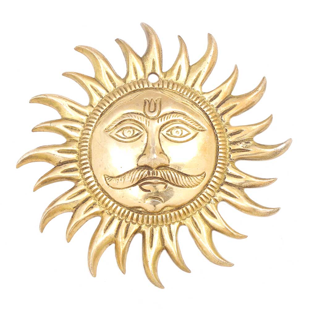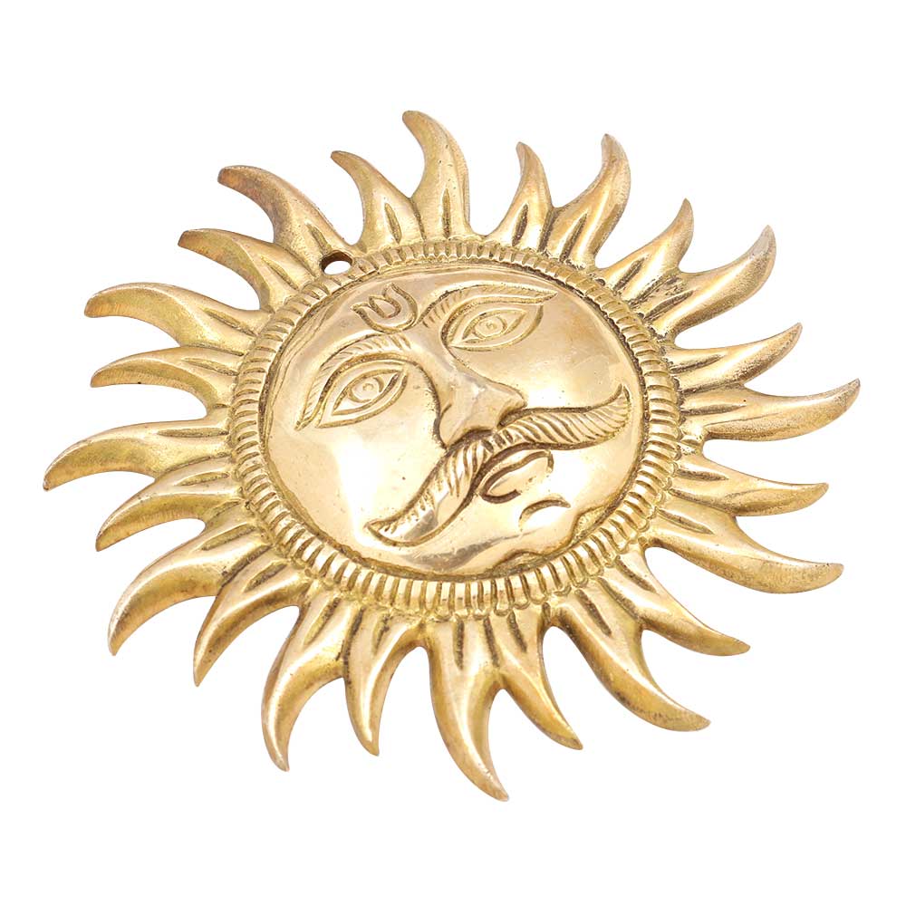 The Sun is worshiped in India and is considered very sacred as he illuminates our lives with his divine rays. This Sun bell brings forth to you one such intricately crafted Sun along with his rays crafted mystically to it. This Sun bell brings forth to you one such intricately crafted Sun along with his rays crafted mystically to it. The painstaking effort of the craftsman is highly appreciated in the carving of Lord Surya Bhagavan within the Sun plate. This is an Indian design sculpture of Sun. In the Hindu religion, sun is a revered god. In this sculpture Sun has the face of a human being, much in the same way as we see in other Hindu gods. Rays of light are coming out all around the face. There is a groove on the top to hang this metal art on the wall.