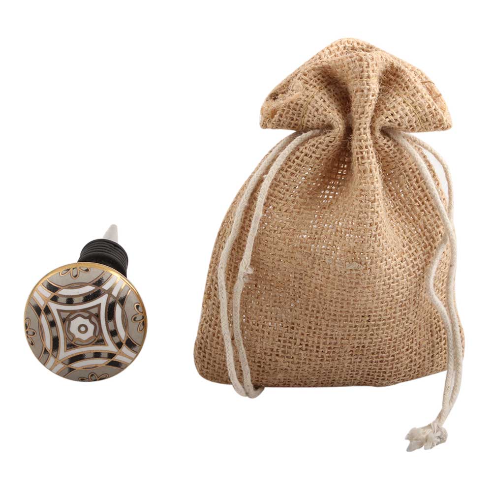 Golden Ceramic Floral Wine Stopper. Zinc Alloy Wine Bottle Stopper with Attractive Jute Bag Packaging.
