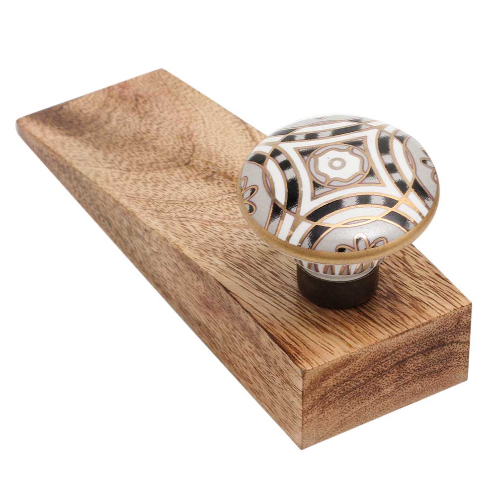 About the Product Handmade Ceramic Wooden Door Stopper.Wooden Door Stopper with a Ceramic Knob to Carry it Easily. This Wooden Door Stopper has Glue Dots under it to Ensure that it does not Slip. It is Handmade by the Craftsmen of India and this Innovative Door Stopper won't Disappoint You. Why Choose Our Product? 100% Handmade in India Premium Quality Hardware, Rust Free and Long Lasting Kids Friendly, No Sharp Edges on Corners All Hardware is Included, No Additional Hardware is Required Product Specification Pack of 1 Piece As it Appears