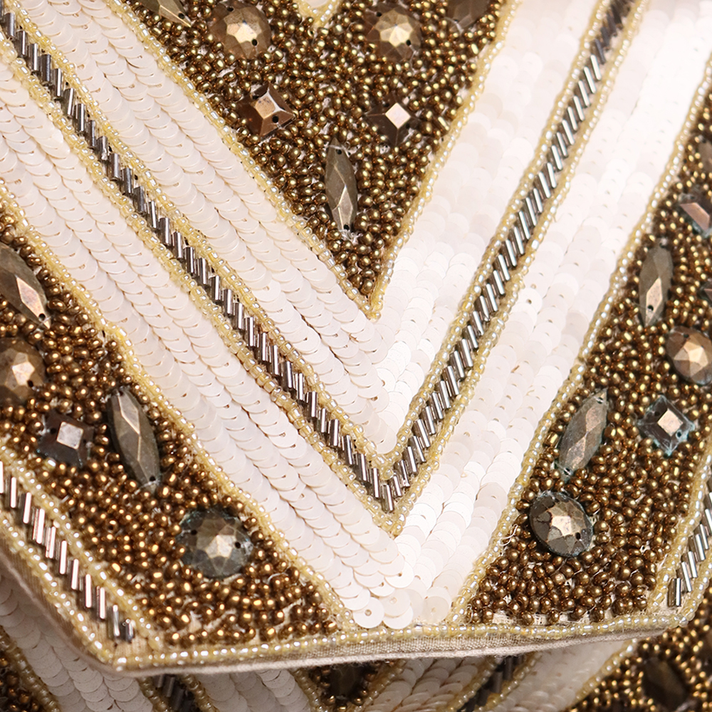- Material: Hand-beaded exterior with detailed embellishments