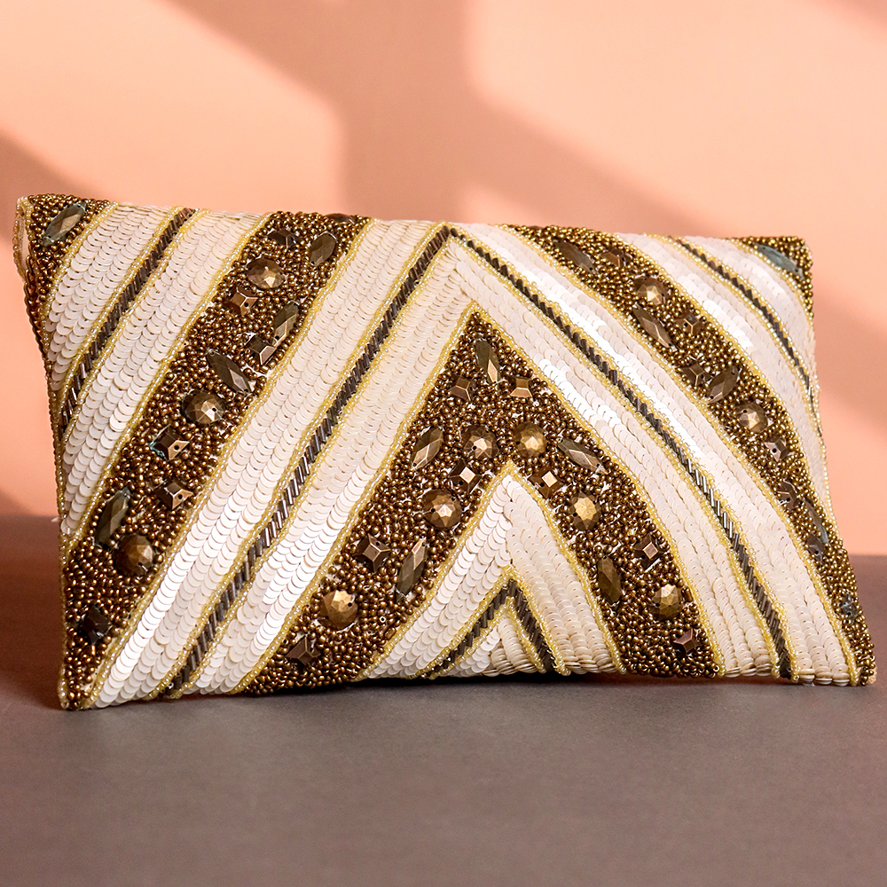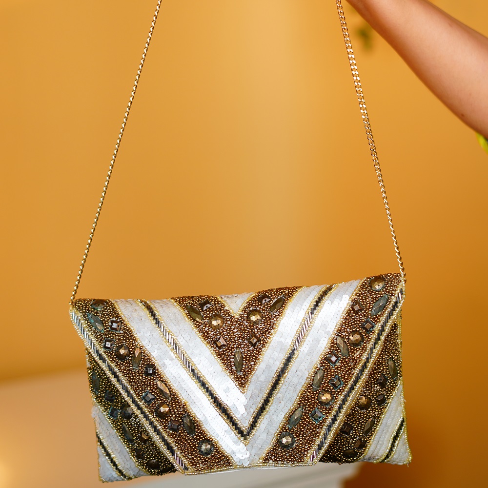 Elevate your evening style with this luxurious Golden Chevron Hand-Beaded Clutch. Featuring a rich blend of metallic gold, bronze, and ivory beadwork arranged in a bold chevron pattern, this bag exudes vintage glamour and festive elegance. Intricate embellishments and sequins add shimmer and texture, while the sleek gold chain strap offers versatility for hands-free carry.Perfect for weddings, cocktail parties, or upscale dinners, this clutch complements everything from sarees to gowns and instantly adds sparkle to your ensemble.