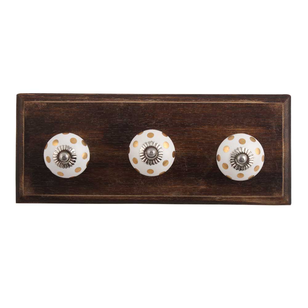 Golden Dot Ceramic Wooden Hook. A Perfect Complement to the Soft Tone of the Wood are these White Traditional Hat & Coat Hook Made of Genuine Porcelain and Brass. It can be use to Hang Jewellery, Leashes, Towels, Scarves, Light Weight Sweaters, Caps Etc.