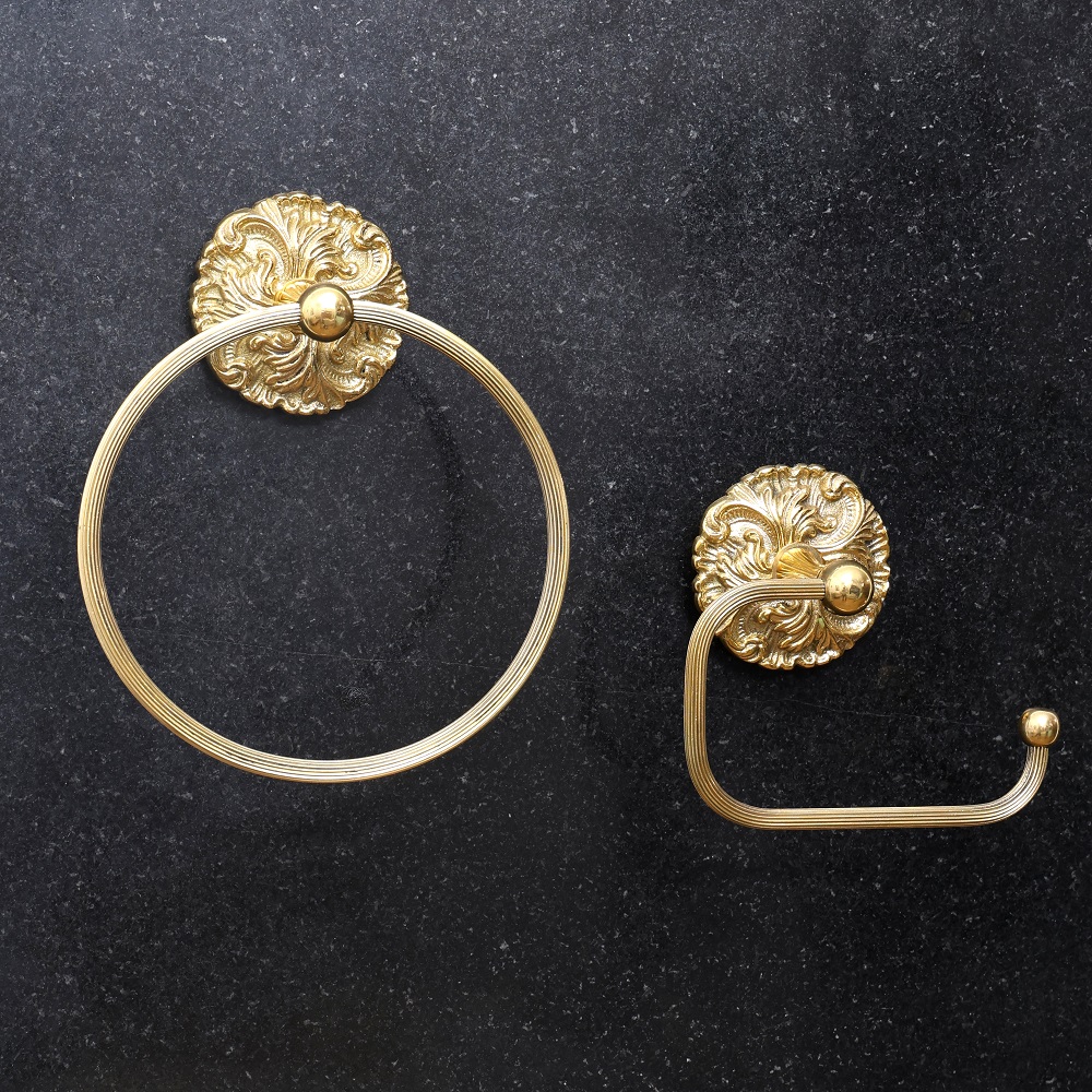 Add a touch of luxury to your bathroom decor with the Golden Finish Brass Towel Holder and Toilet Paper Holder. This elegant set instantly elevates your space with its warm, polished brass construction. The attention grabbing design makes storing towels and toilet paper not only practical but beautiful too. With its sleek bars and curved holders, this towel and toilet paper set brings a hint of hotel style into your own home. The holders keep essentials neatly in place while complementing your existing decor. Crafted from solid brass with an antique finish, the set adds a pop of shine and sophistication. If you want to add a touch of luxury to your bathroom, this towel and toilet paper holder set is just what you need. The polished antique brass finish and high end details will make your space look pulled together and elegant. Plus, the holders keep your towels and toilet paper neatly organized and within arm's reach.