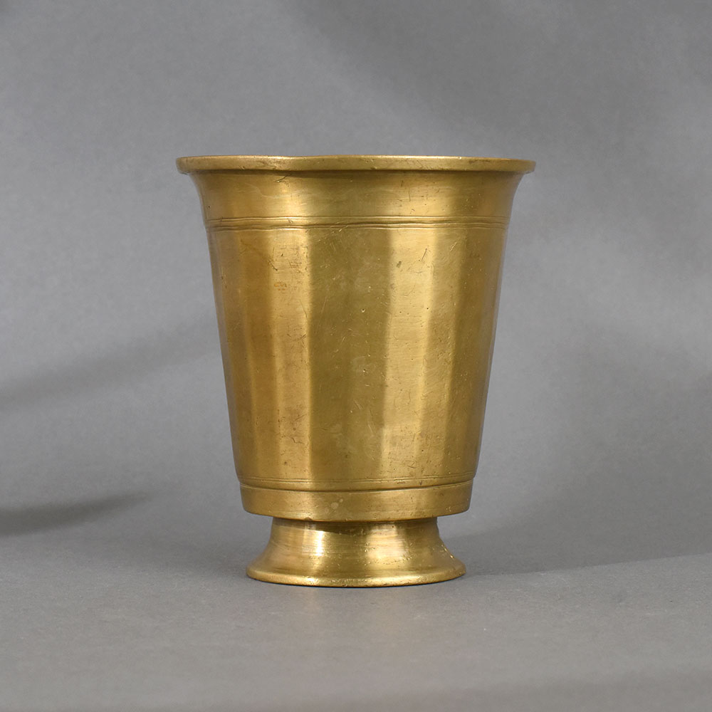 This elegant brass holy glass pot is a classic representation of traditional South Indian ritualware, designed for sacred use in Hindu religious ceremonies. Crafted from solid brass, the vessel features a gently flared cylindrical form with subtle vertical paneling and a smooth, elevated pedestal base. The polished golden finish and understated design reflect purity and grace, making it both functional and spiritually symbolic. Used in temples and home altars, this pot is ideal for holding Gangajal (holy water), panchamrit, or sacred milk during puja, abhishekam, and other devotional rituals. The sturdy base provides excellent stability on altars, while the wide rim allows for easy handling and precise pouring. Its durable brass construction ensures longevity and resistance to ritual wear.