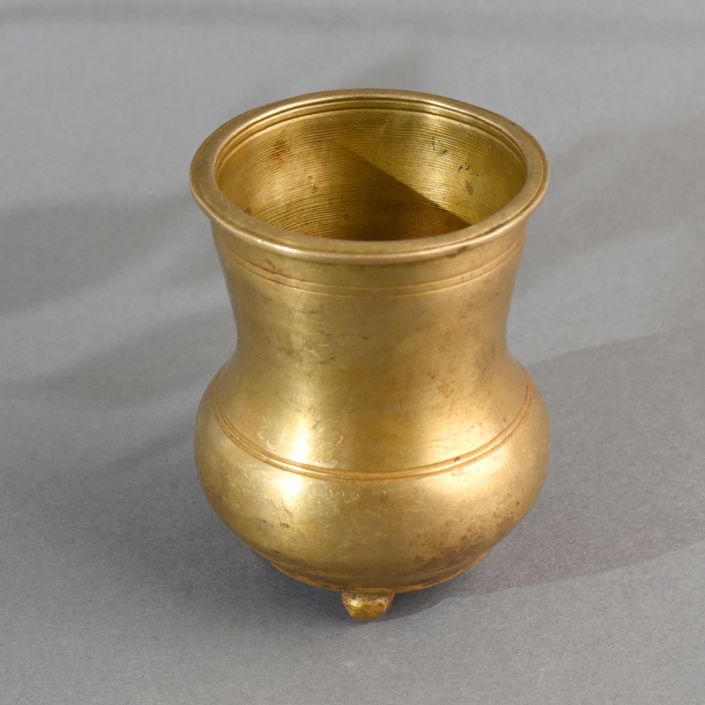 This beautifully crafted brass Panchpatra holy water pot is a classic example of Indian ritualware, used for sacred purposes in Hindu worship. Made from solid brass, it features a rounded body that gently tapers at the neck and flares at the rim, supported by a rare and distinctive three-legged base. Subtle linear engravings near the rim and midsection add a touch of elegance, while the natural golden patina gives it an antique charm. Used in daily puja, abhishekam, and other ceremonial practices, the Panchpatra is designed to hold Gangajal (holy water) and is often paired with an uddharani (spoon). Its raised base provides added stability and signifies purity by preventing direct contact with the ground. Brass, widely revered in Hindu tradition, is believed to purify energy and maintain spiritual balance.