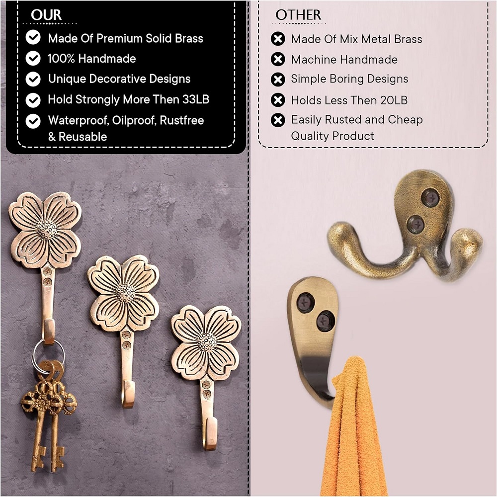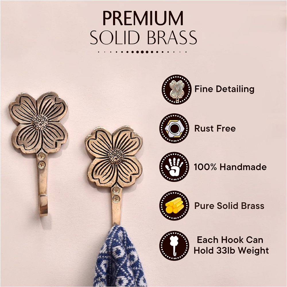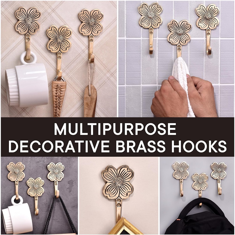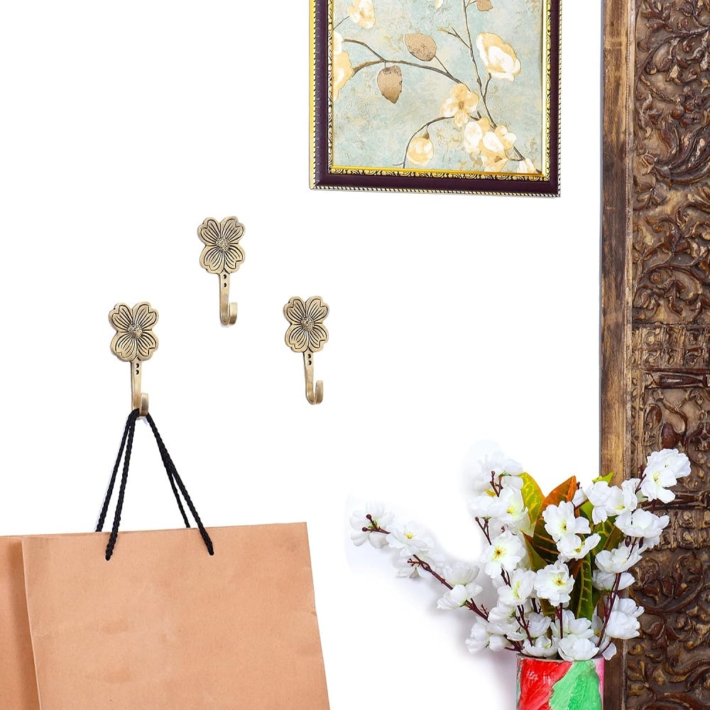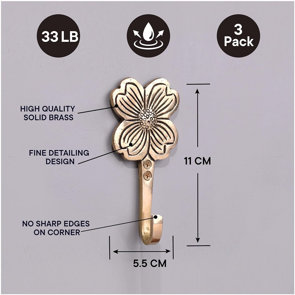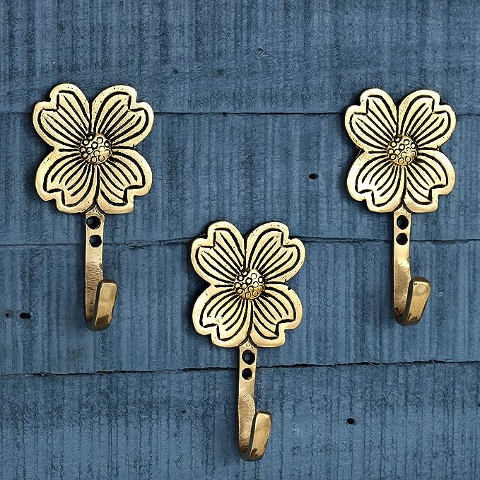Indianshelf.com for bulk/wholesale orders.Indianshelf.us for personal purchases.Enhance your home decor with the Golden Flower Brass Wall Hooks, a set of three beautifully designed hooks that combine both elegance and functionality. Crafted from durable brass and featuring a stunning golden flower design, these hooks add a touch of luxury to any room. Perfect for hanging coats, bags, hats, or towels, these hooks are as practical as they are decorative.