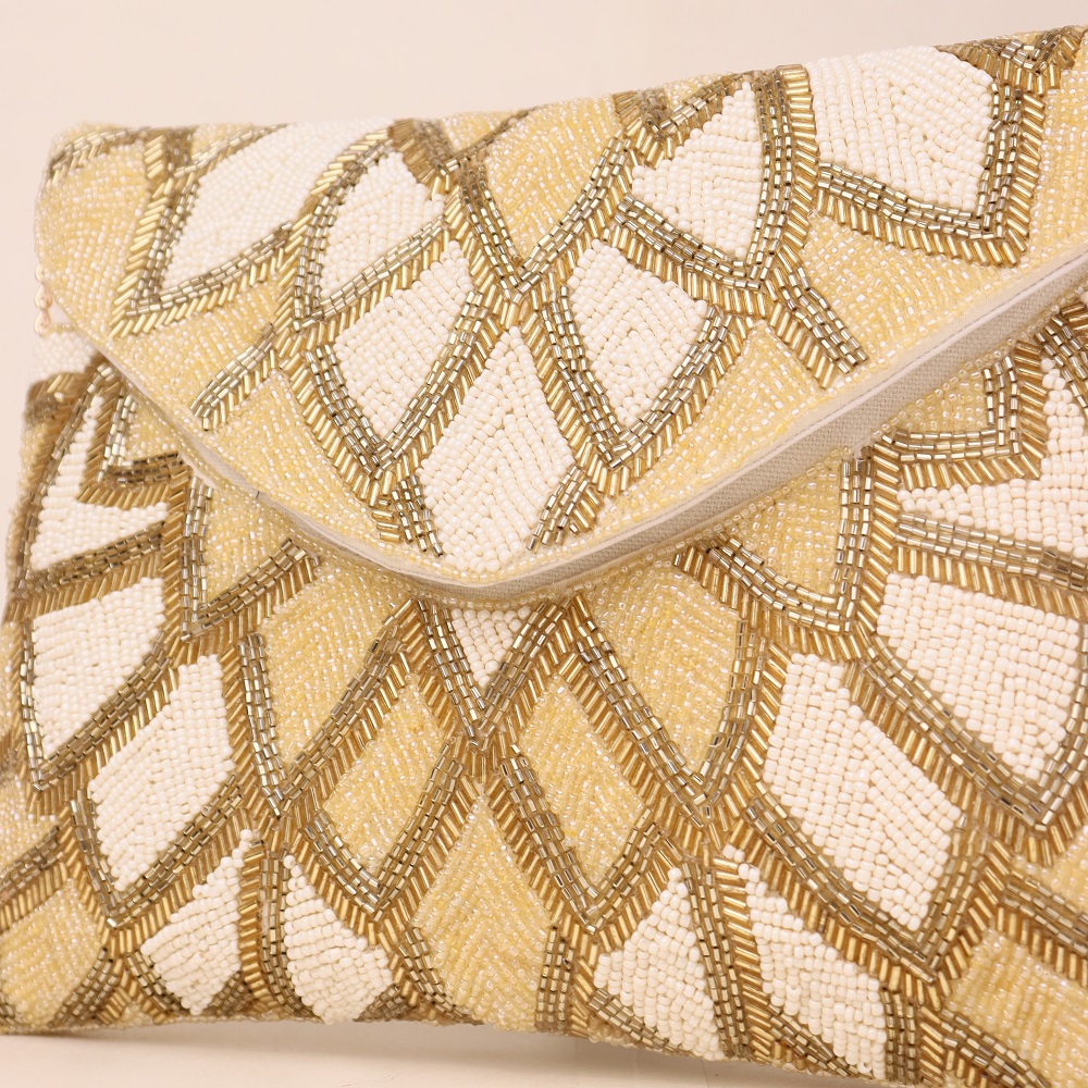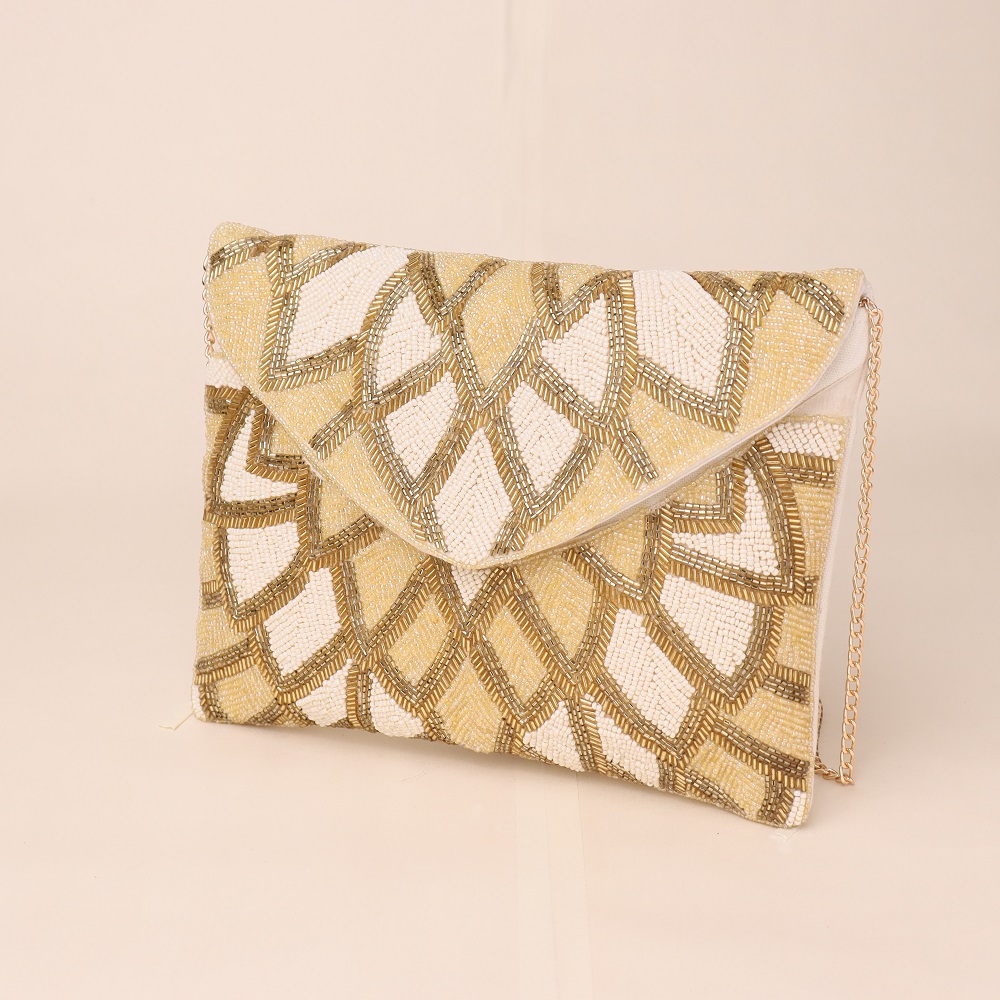 Radiate elegance with this hand-beaded envelope clutch, featuring a stunning petal-like geometric pattern that exudes timeless charm. The soft luster of the beadwork offers a subtle shimmer, making it the perfect accessory for festive occasions, weddings, or elegant evenings out. The detachable gold chain strap adds versatility, allowing you to style it as a shoulder bag or carry it as a statement clutch.