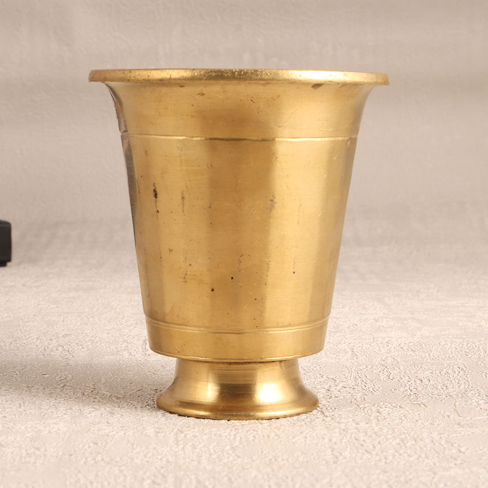 Enhance your spiritual space with the timeless elegance of our vintage brass holy water glass. Handcrafted by skilled Indian artisans, this exquisite piece showcases the artistry of South Indian craftsmanship. Made from high-quality brass, it exudes a warm, antique golden finish that lends an aura of sanctity and grace. The holy water glass is traditionally used during prayer, havan, and rituals, and holds a special place in Indian religious traditions. Its authentic design and vintage appeal make it a cherished addition to any sacred setting, whether at home, in an office, restaurant, hotel, or cafe's prayer room. Place it on your altar or as a centerpiece for floral arrangements, and let its divine charm radiate throughout the space. This brass holy water glass is not only a symbol of devotion but also a thoughtful gift for your loved ones on special, festive, or auspicious occasions.