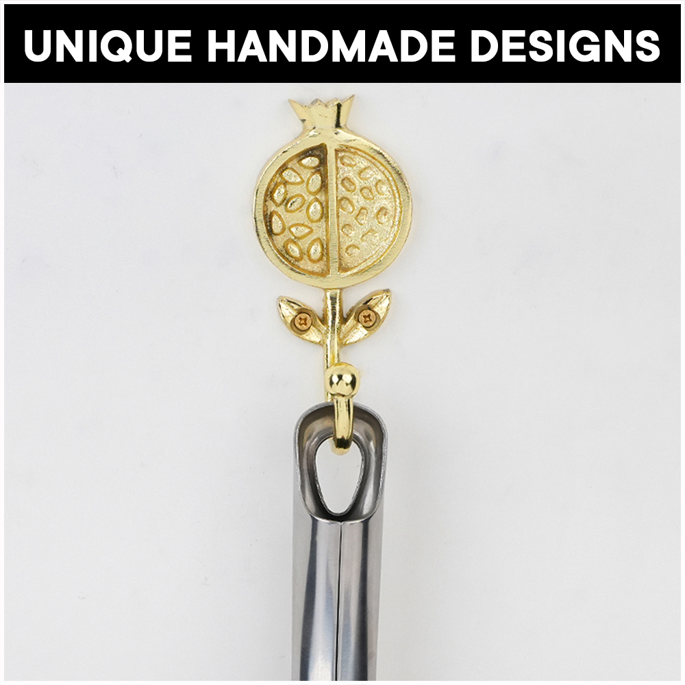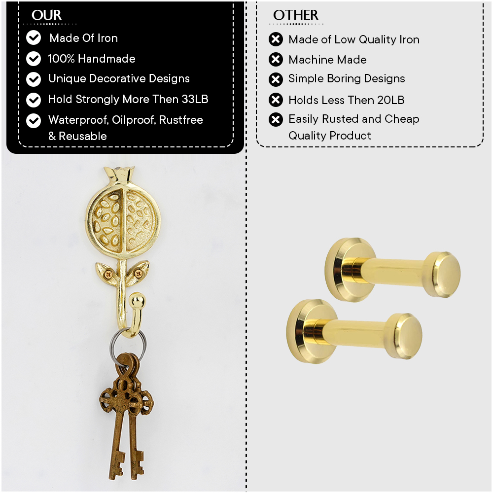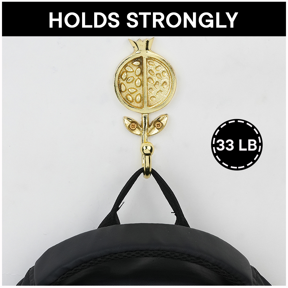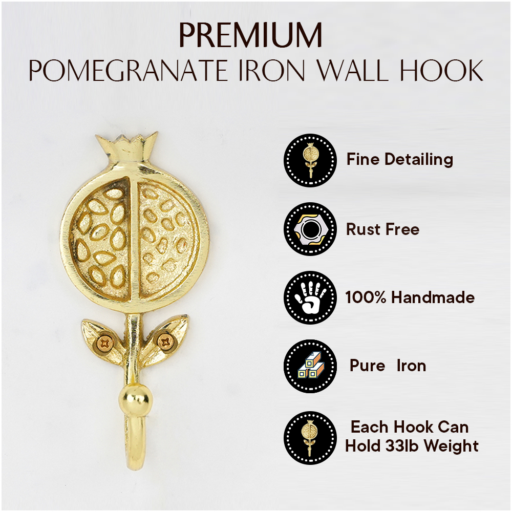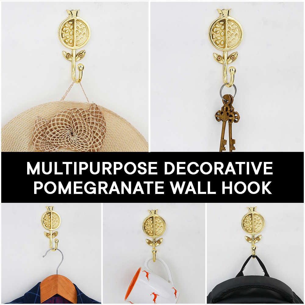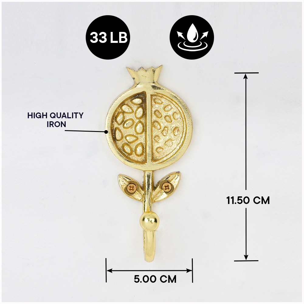 Bring a touch of artistic charm and functionality to your home with this Pomegranate Design Iron Wall Hook. Beautifully crafted from high-quality iron, this wall hook features a unique fruit-inspired motif that adds a refreshing and elegant look to your dcor. Perfect for hanging bags, scarves, hats, coats, or keys, it combines strength with style. The glossy golden finish makes it a striking accent on any wall whether in your entryway, bedroom, bathroom, or kitchen. Durable and easy to install, this hook is as practical as it is decorative.