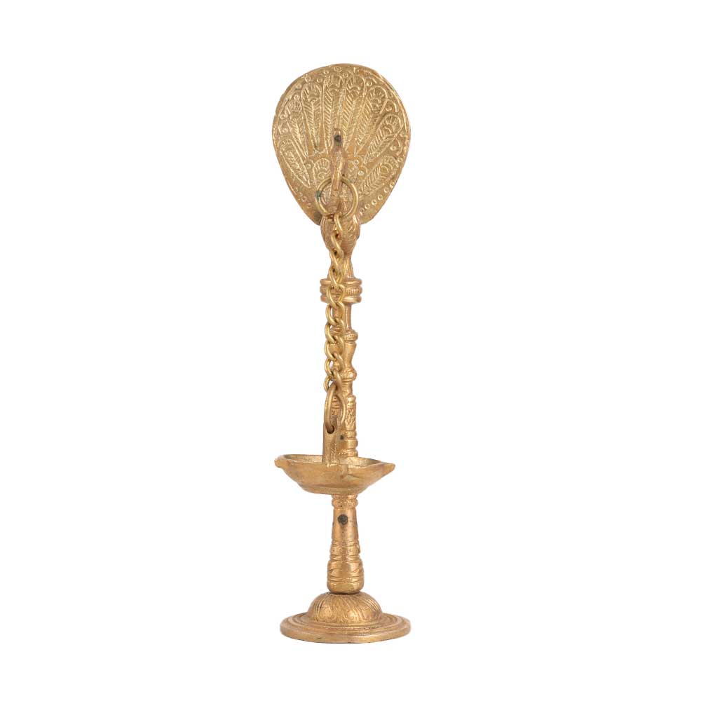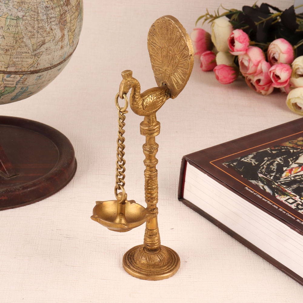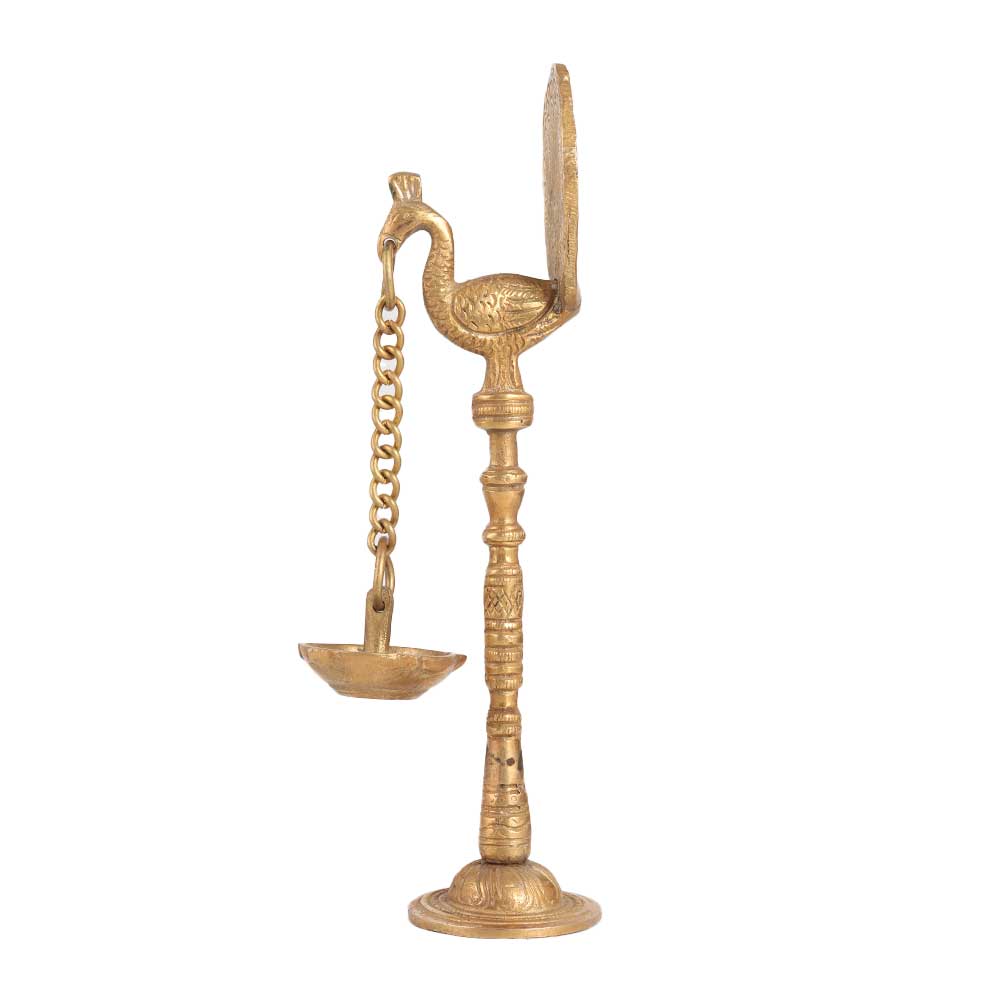 Buy a stunning brass golden oil lamp which is an exquisite piece of art that will add a touch of elegance to any home or temple. It is intricately carved with a peacock holding a chain lamp in its mouth, symbolizing grace and beauty. This lamp is typically used for decoration during special occasions and festivals, adding a warm and welcoming ambiance to any setting. The brass material gives it a luxurious look and ensures its durability and long-lasting beauty. The lamp is designed with intricate detailing that showcases the mastery of Indian art and craftsmanship. Its timeless appeal and cultural significance make it a perfect gift for anyone interested in Indian culture and tradition. Gift it to your loved ones on special, festive and auspicious occasion.