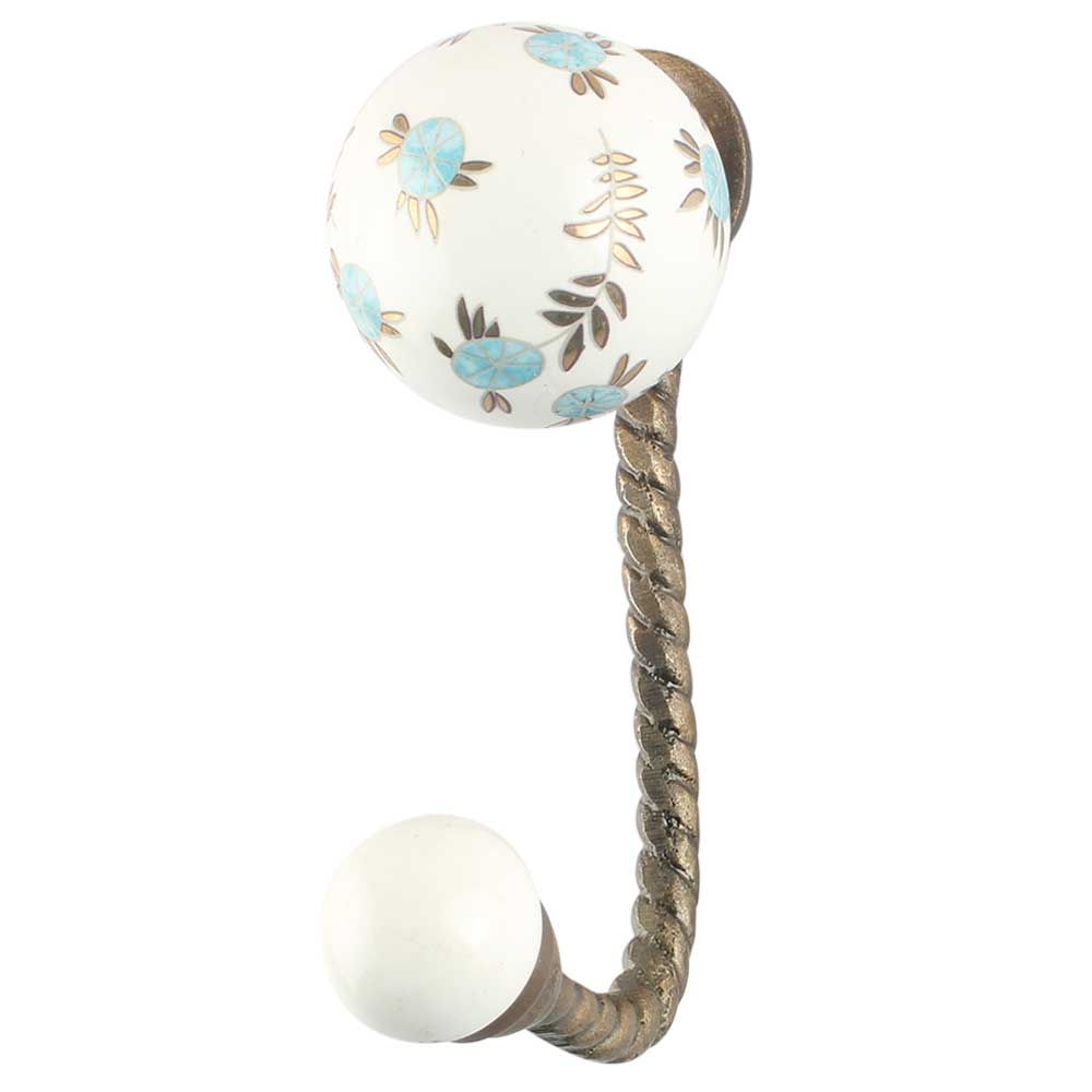 Material: Glazed ceramic knob with gold leaf design, mounted in antique-finish iron fitting Finish: Glossy white ceramic with gold detailing; aged brass/bronze metal fitting Installation: Includes screw and wall anchor for secure mounting