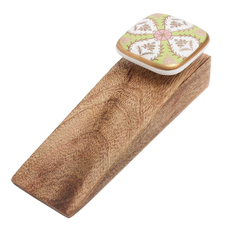 Handmade Ceramic Wooden Door Stopper.Wooden Door Stopper with a Ceramic Knob to Carry it Easily. This Wooden Door Stopper has Glue Dots under it to Ensure that it does not Slip. It is Handmade by the Craftsmen of India and this Innovative Door Stopper won't Disappoint You.