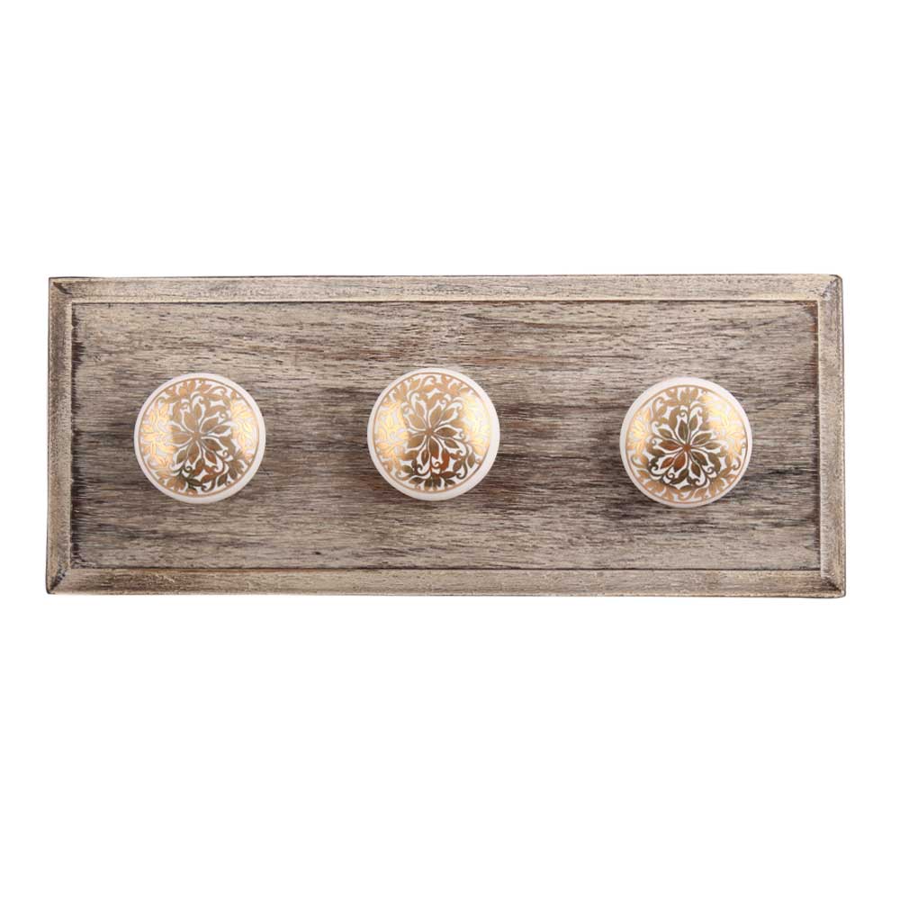 Golden Ornamental Flower Flat Ceramic Wooden Hook. A Perfect Complement to the Soft Tone of the Wood are these White Traditional Hat Coat Hook Made of Genuine Porcelain and Brass. It can be use to Hang Jewellery, Leashes, Towels, Scarves, Light Weight Sweaters, Caps Etc.