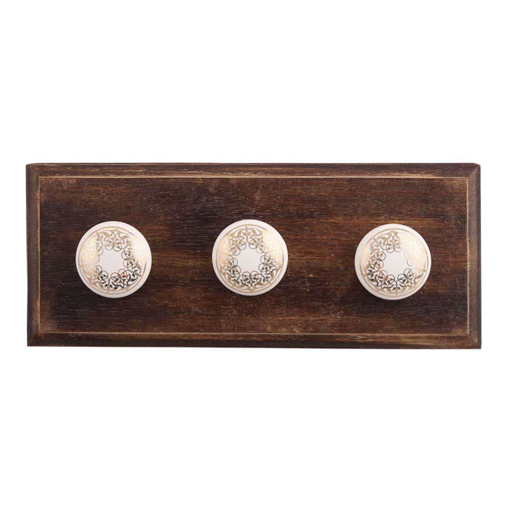 Golden Rangoli Pattern Flat Ceramic Wooden Hook. A Perfect Complement to the Soft Tone of the Wood are these White Traditional Hat Coat Hook Made of Genuine Porcelain and Brass. It can be use to Hang Jewellery, Leashes, Towels, Scarves, Light Weight Sweaters, Caps Etc.