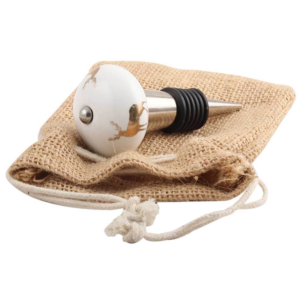 Golden Standing Rein Deer Pattern Ceramic Wine Stopper.zinc alloy wine bottle stopper with attractive Jute Bag Packaging.