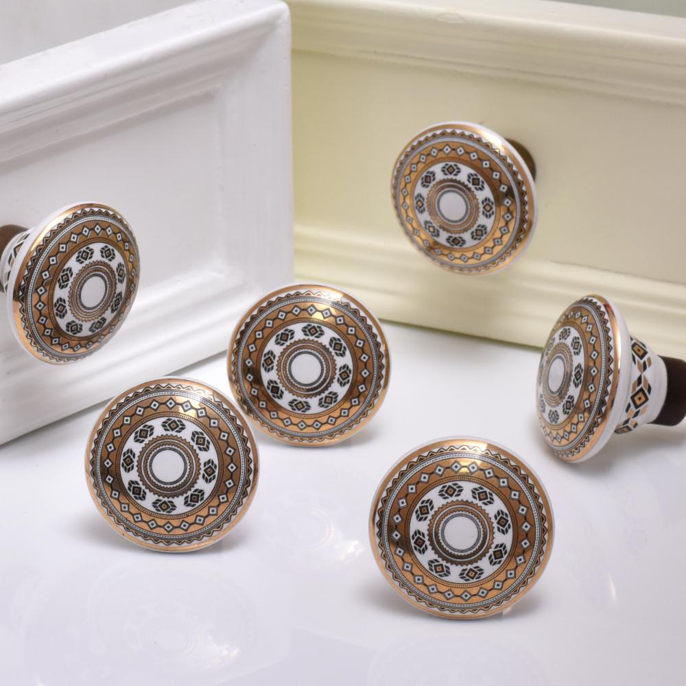 Transform your furniture with the Golden Wheel Pattern Flat Ceramic Cabinet Knob. The circular wheel design with intricate golden detailing brings a luxurious, timeless aesthetic to any room. These knobs are versatile and can be used in a variety of spaces, from traditional to contemporary, adding a decorative flair while also providing ease of use. The gold highlights make them a perfect complement to both dark and light-colored cabinetry, making them an ideal choice for home makeovers or DIY projects.