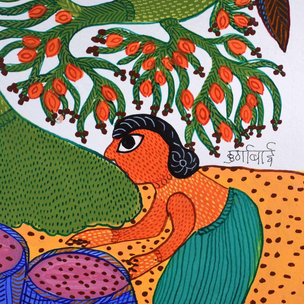 - Acrylic on paper: Durgabai’s choice of acrylic paints on paper enhances the vivid colors and brings depth to the artwork.