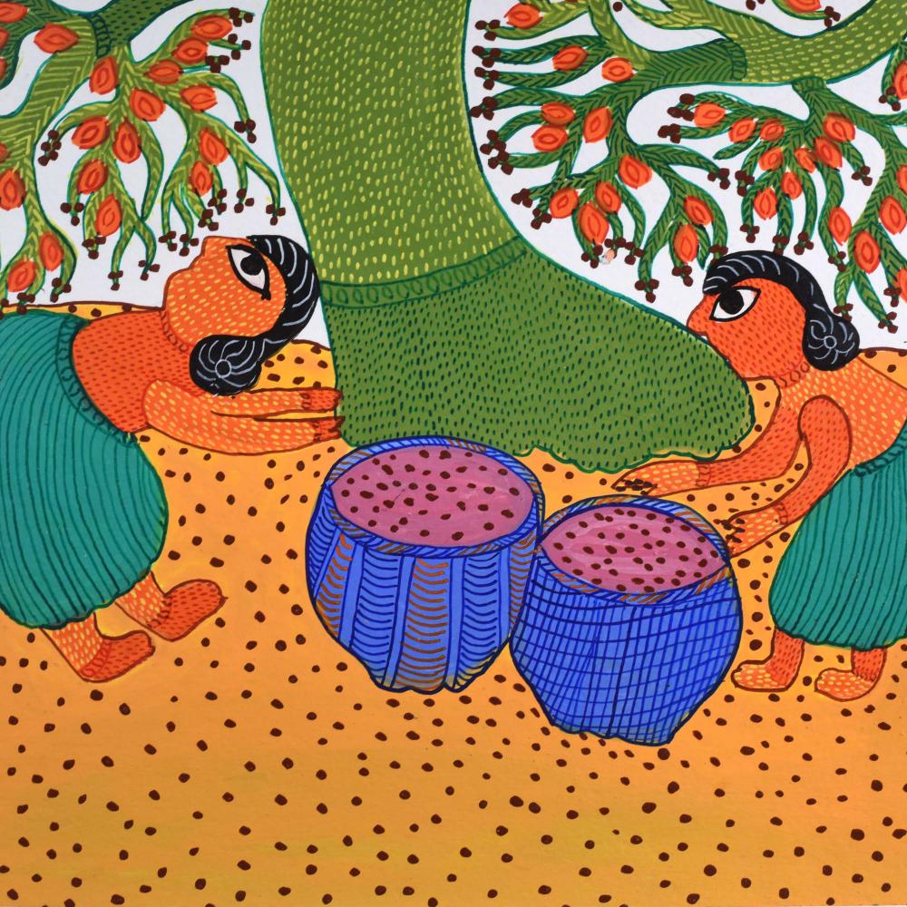 - Intricate dot work: The fine, meticulous dotting technique is characteristic of Gond art, adding texture and life to the composition.