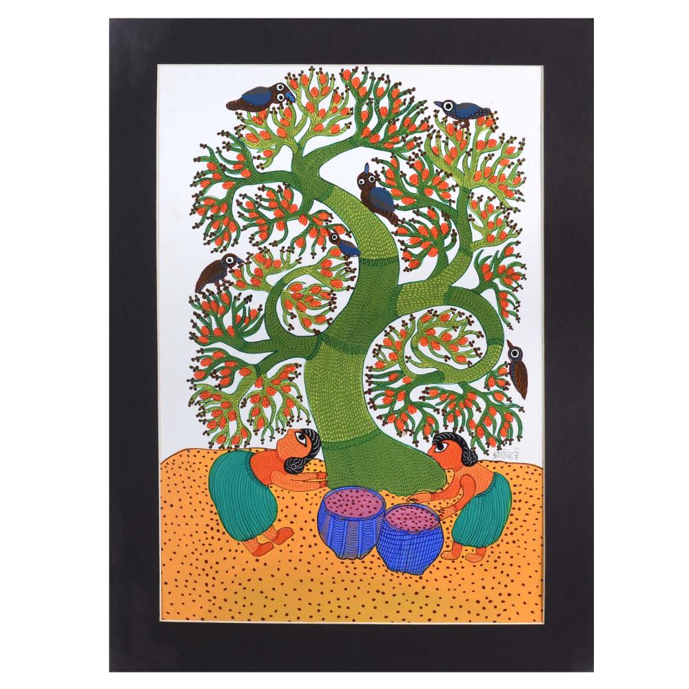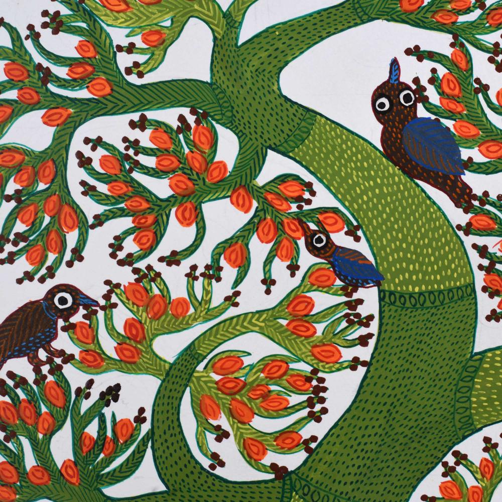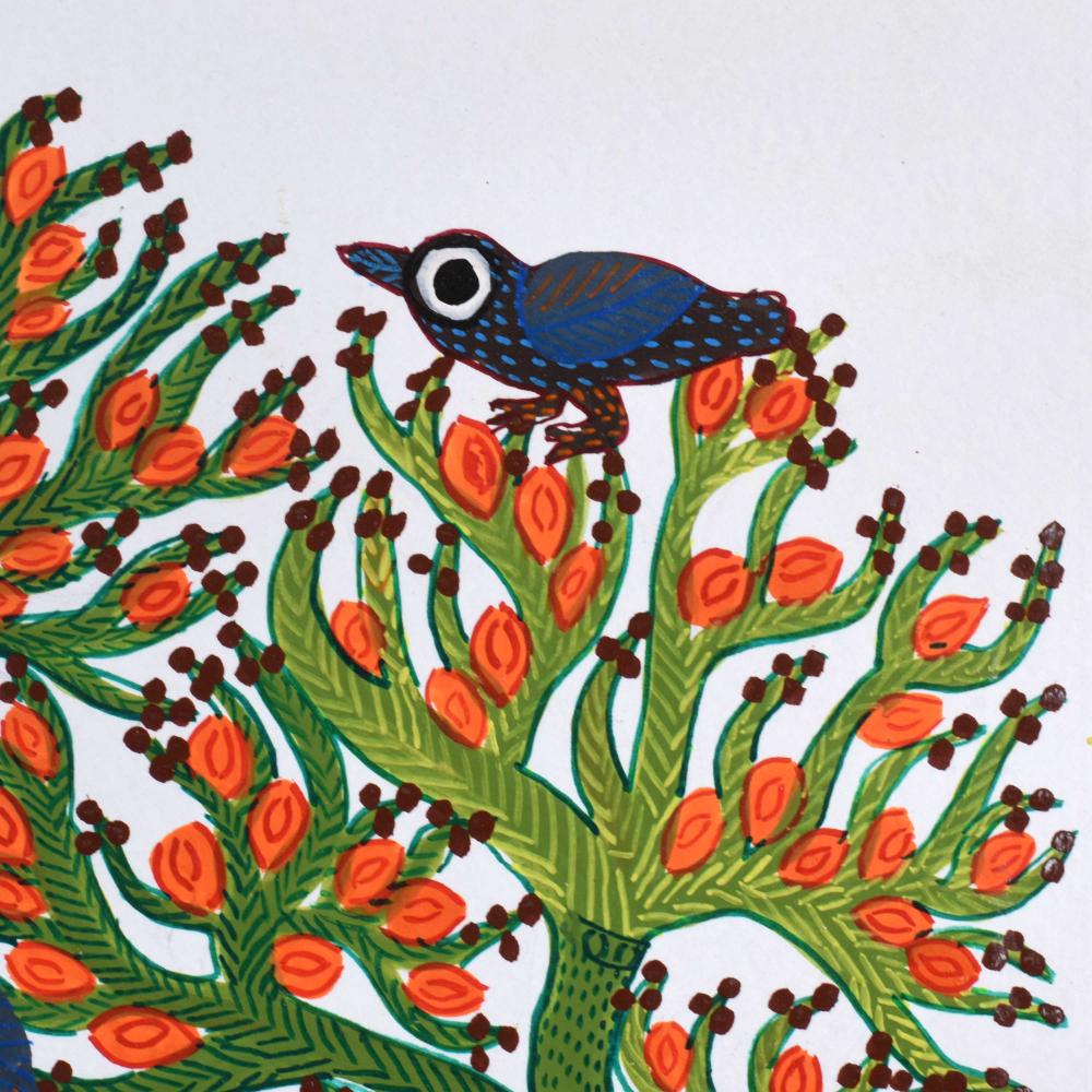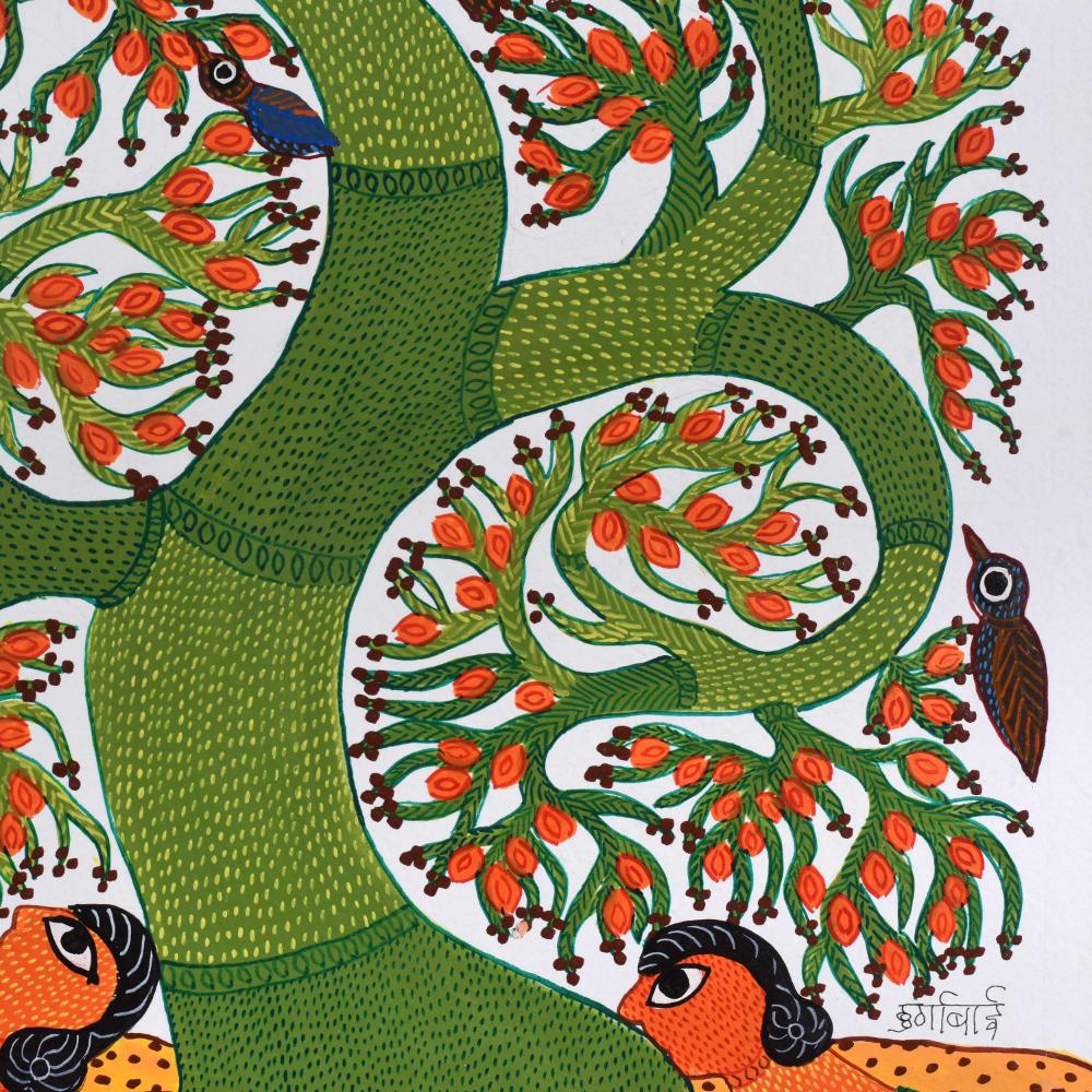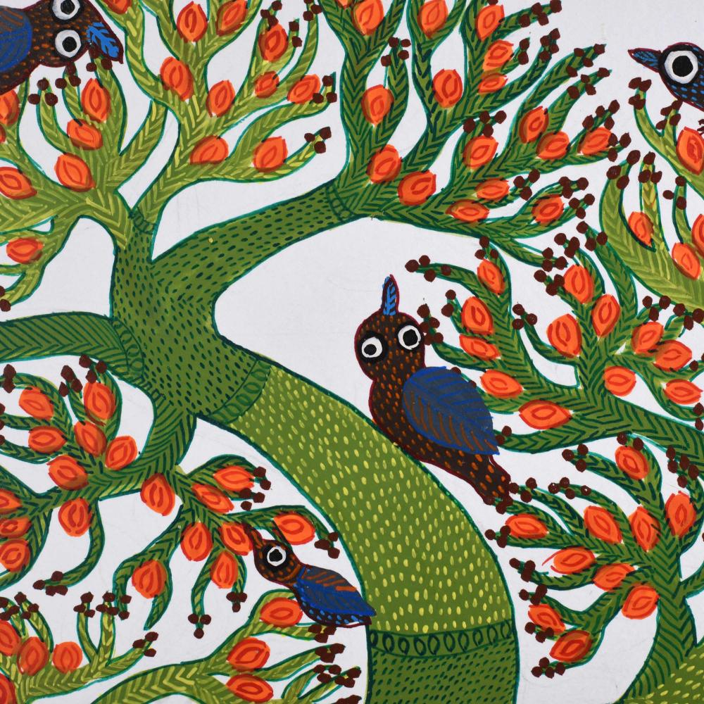 - Vibrant symbolism: The use of birds, tree, and human elements conveys the spiritual and cultural beliefs of the Gond people.