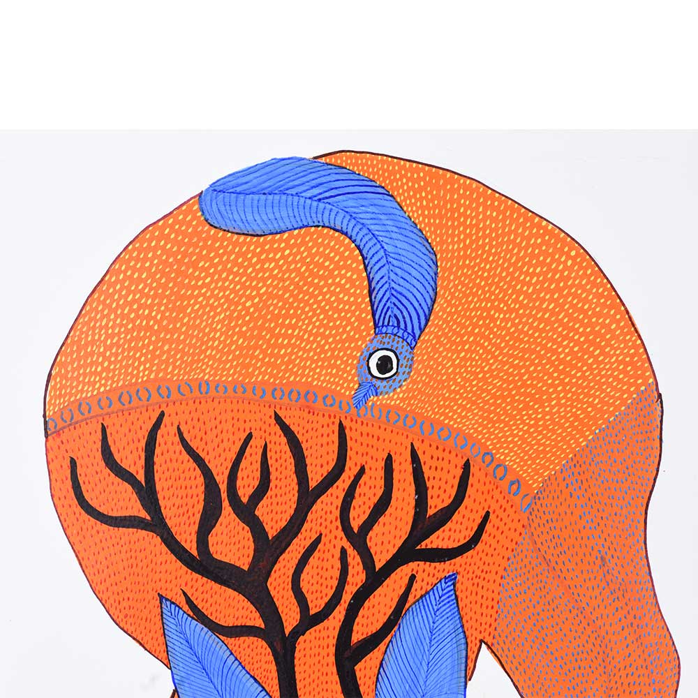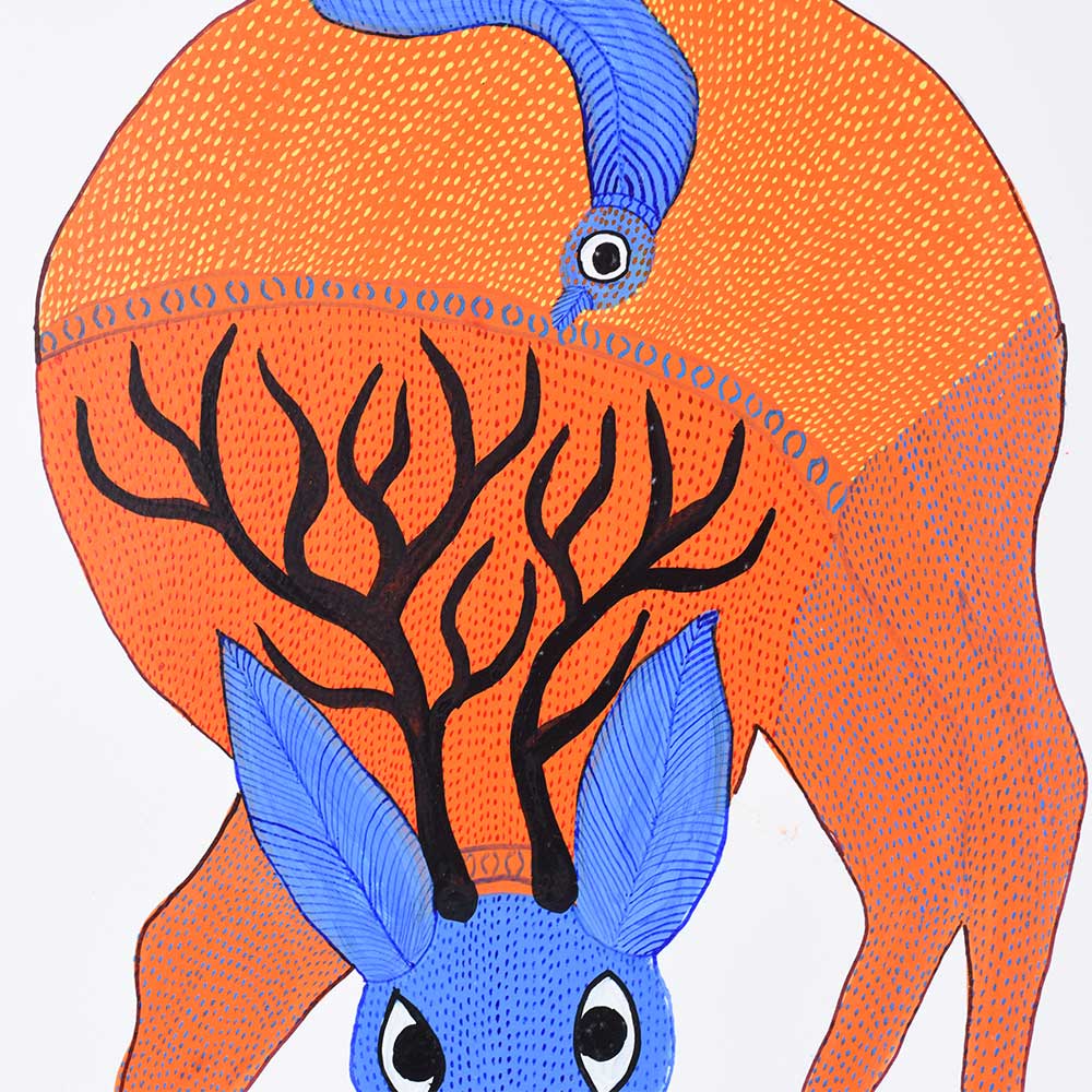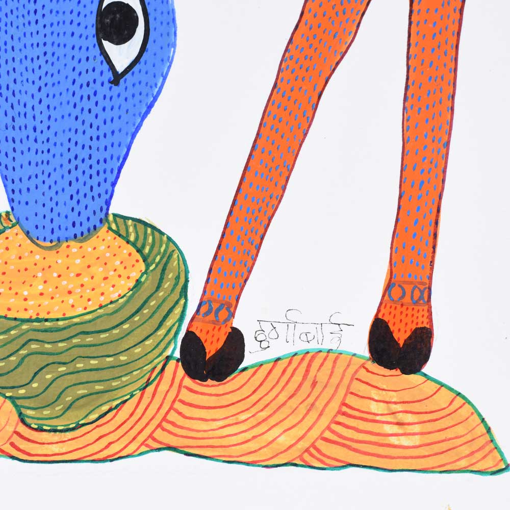 This decorative Gond Art acrylic painting on paper by Durgabai Vyam beautifully depicts a swamp deer in its natural habitat. With graceful lines and intricate patterns, the artist brings this majestic animal to life, reflecting the deep connection between nature and the Gond tribal culture. The swamp deer, often associated with lush landscapes, is presented with delicate strokes and vibrant colors, making it appear almost alive. The use of geometric patterns and bold color choices typical of Gond Art highlights the artist’s skill in blending realism with abstraction. The painting, rich in detail and symbolism, speaks to the beauty and fragility of wildlife, capturing the serene and regal nature of the swamp deer. Durgabai Vyam is a prominent artist from Madhya Pradesh, renowned for her exceptional contributions to the Gond painting tradition. Her art beautifully reflects the deep spiritual connection the Gond people have with nature. In recognition of her work, she was awarded the Padma Shri in 2022, one of India’s highest civilian honors. Durgabai’s work continues to inspire and educate, blending traditional Gond techniques with contemporary flair to keep the art form alive and relevant in the modern world.