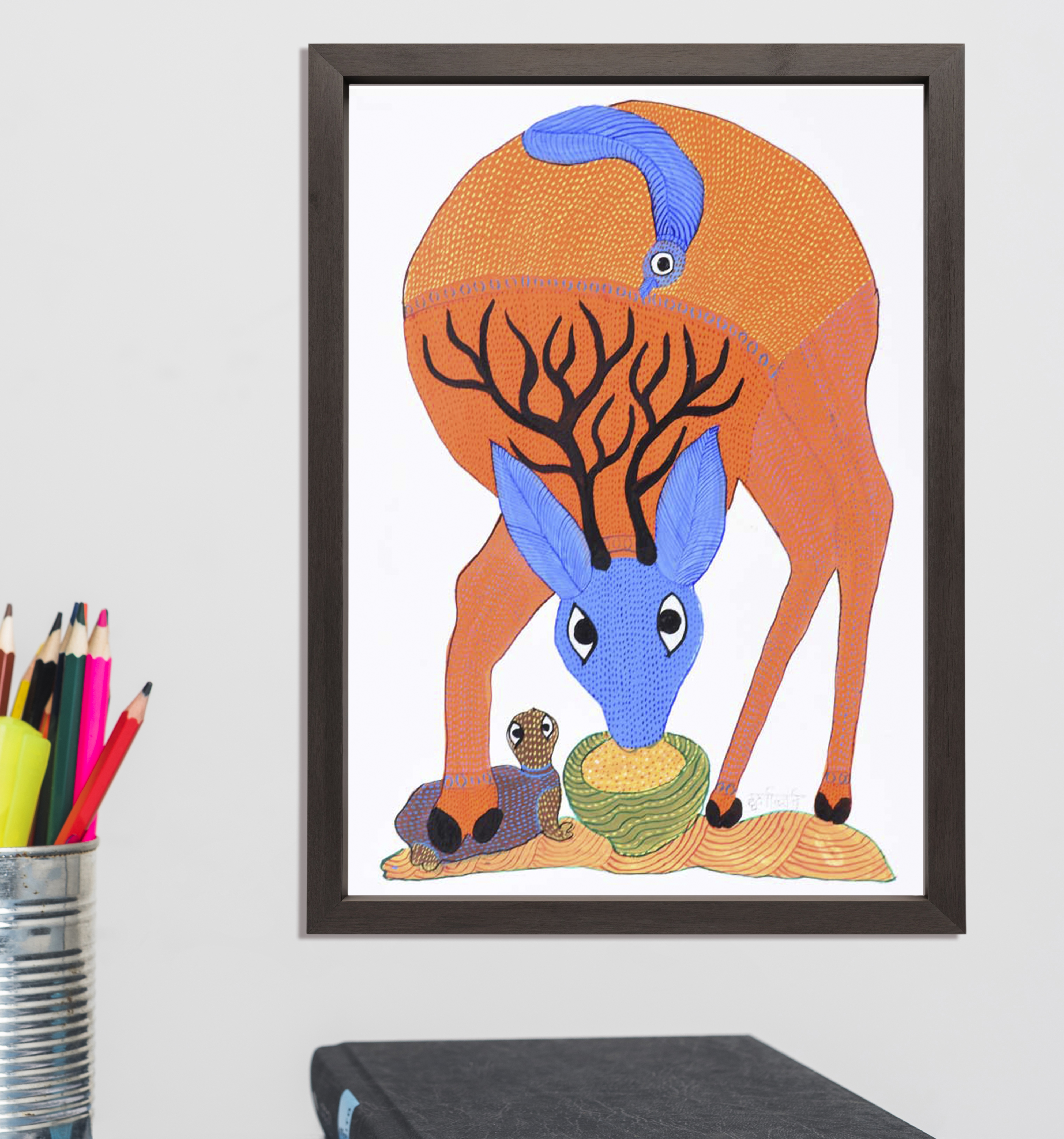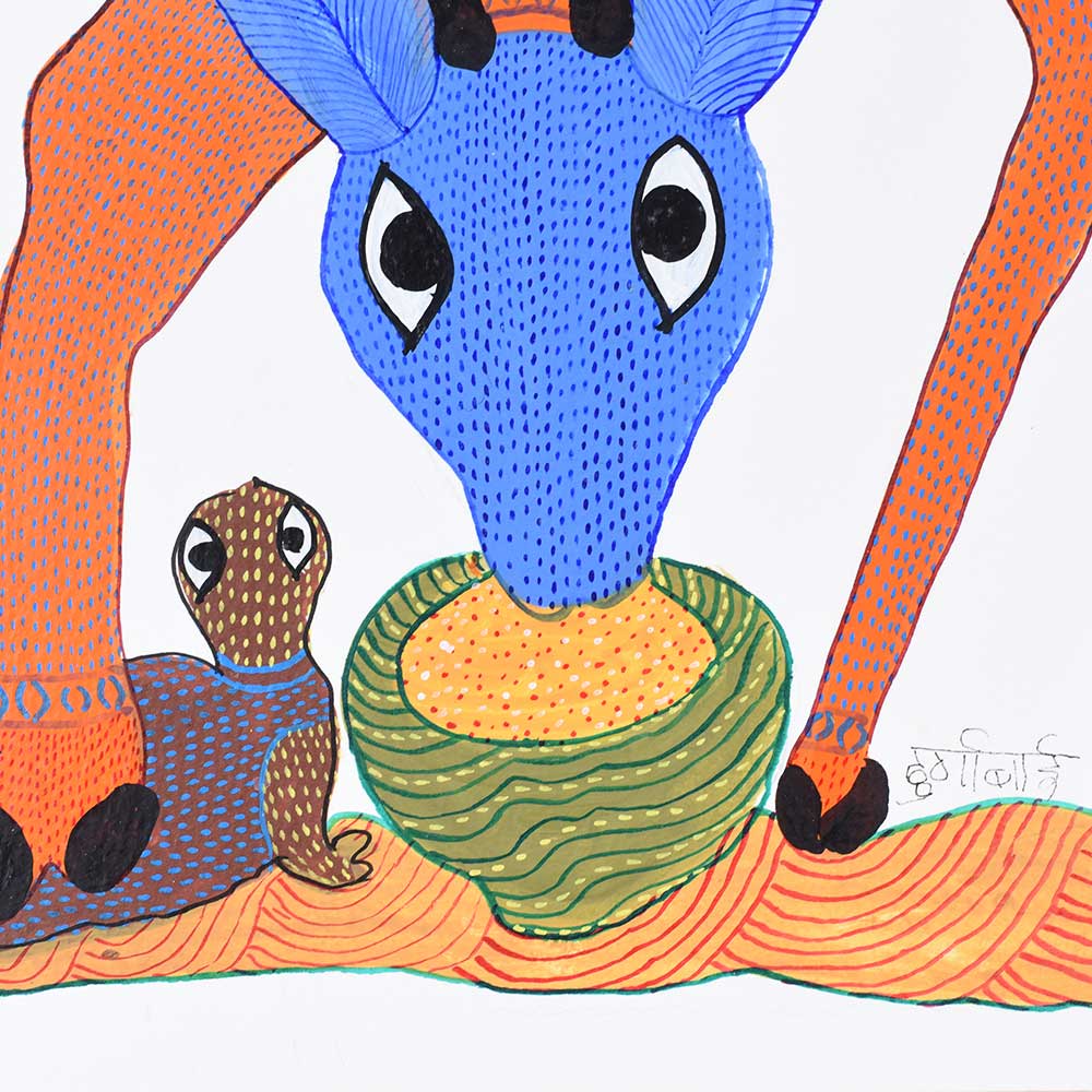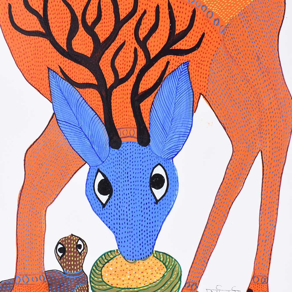 - Features a swamp deer, depicted with fluid lines and vibrant geometric patterns typical of Gond Art.