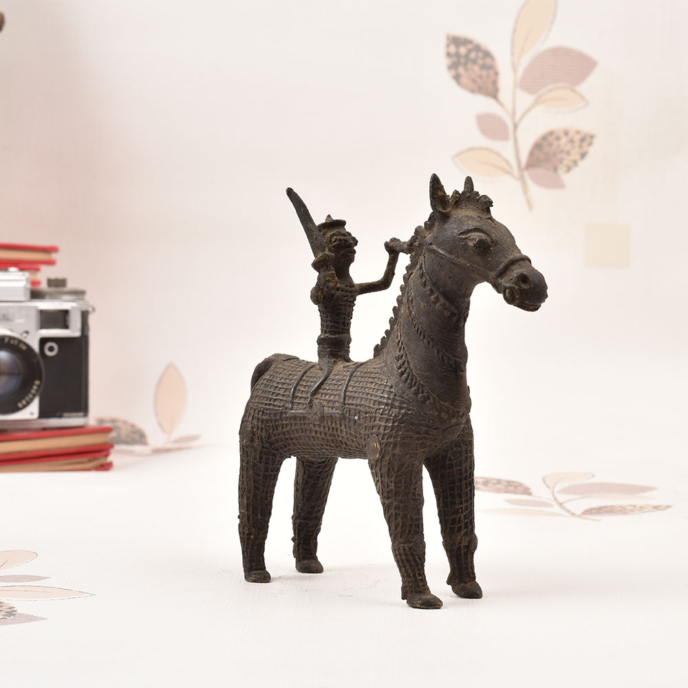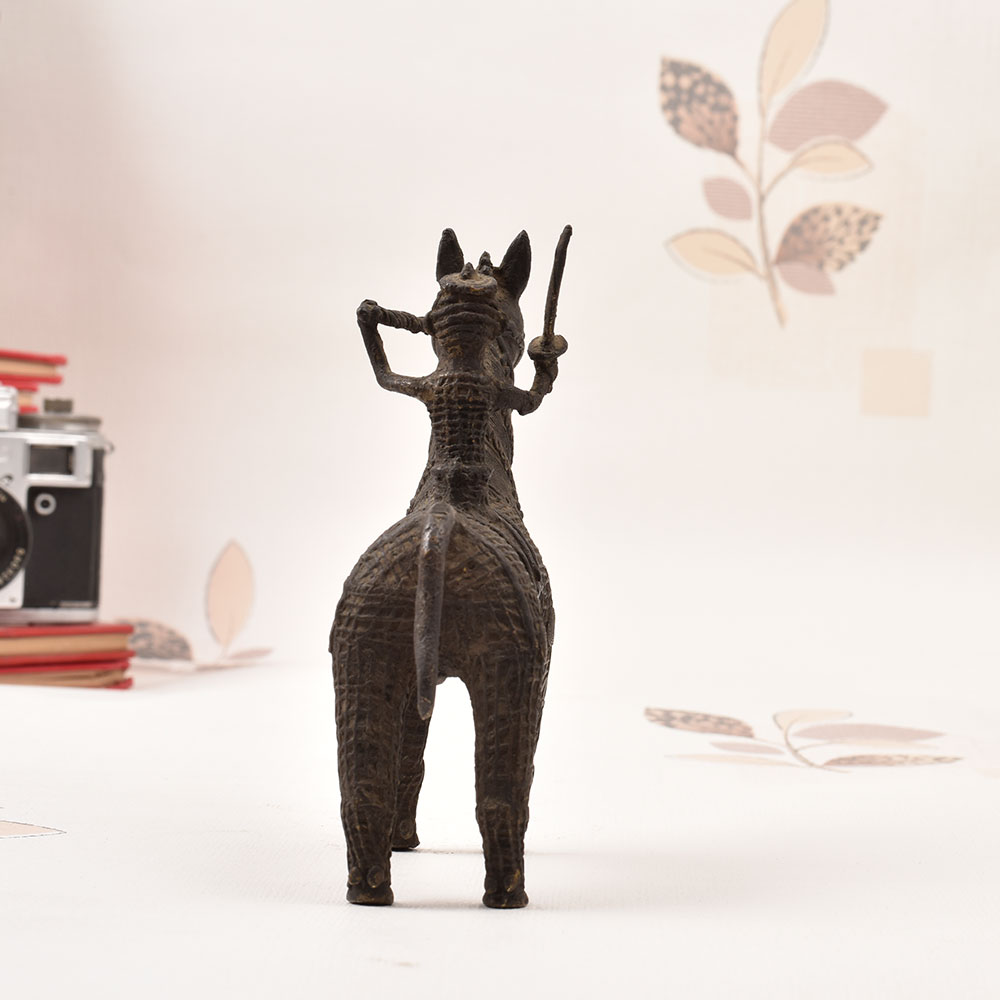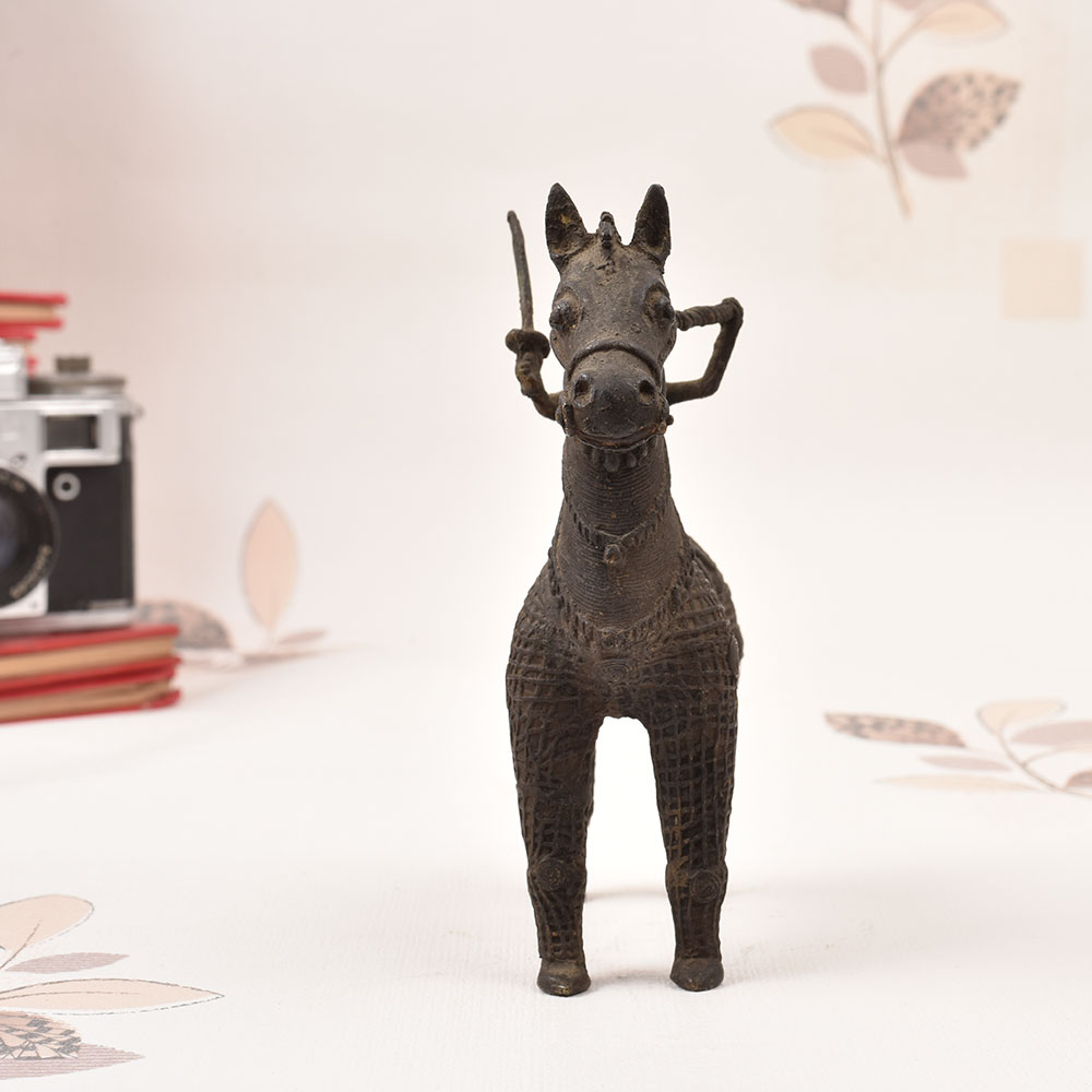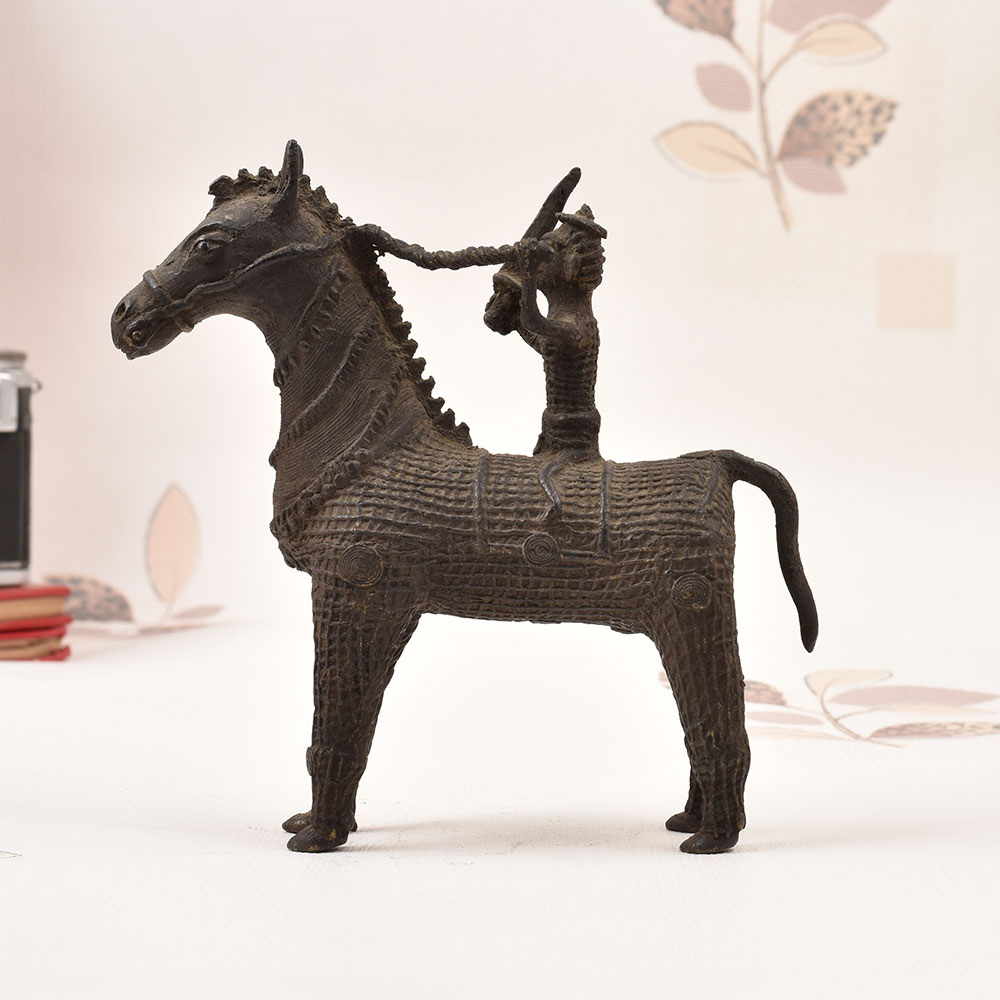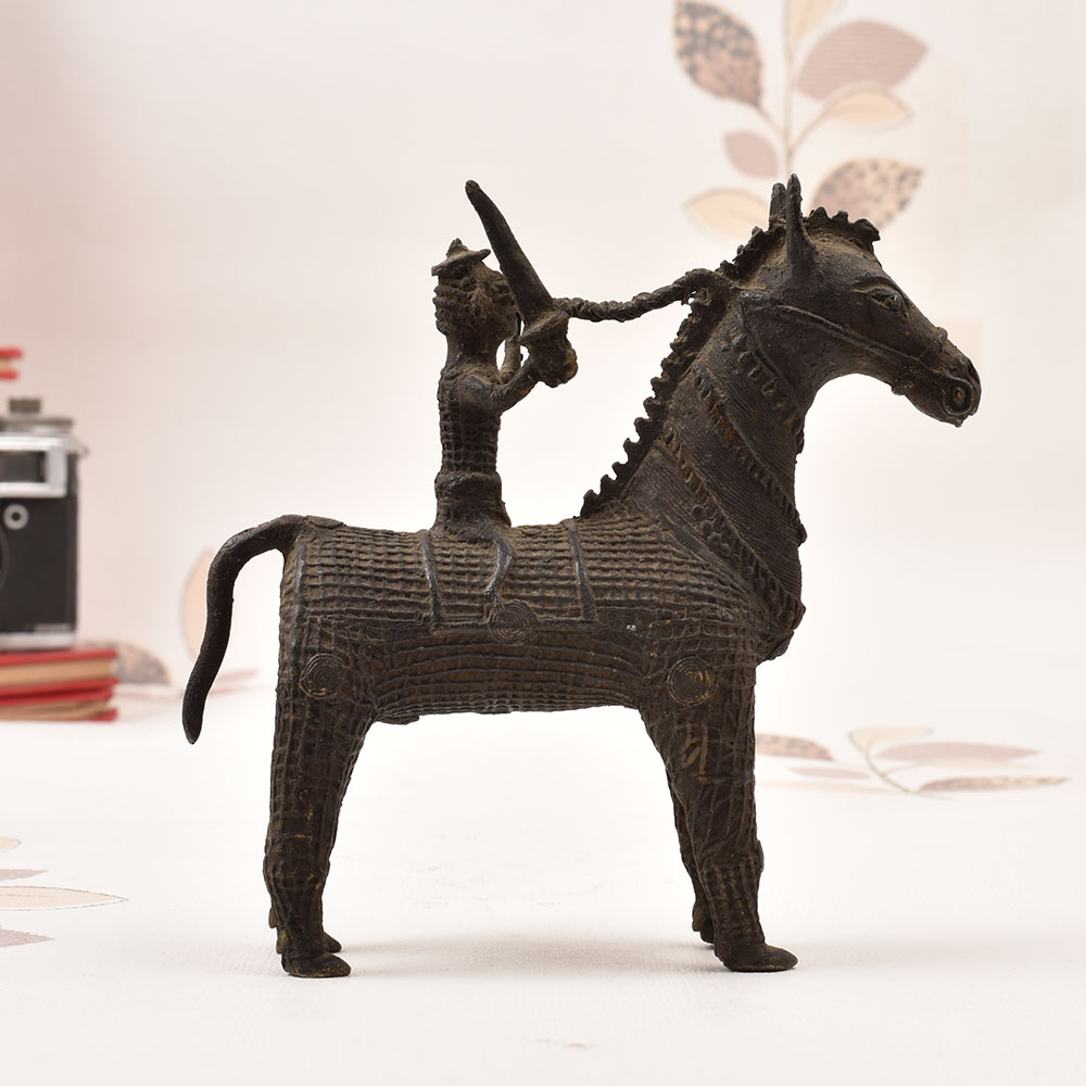 This exquisite brass horse and rider statue is a true work of art, showcasing the vibrant, intricate Gond art style that has been passed down for generations. Meticulously handcrafted, each piece is a unique testament to the skilled artisans who create them. The striking horse and its regal rider are rendered in stunning detail, with a level of craftsmanship that elevates this piece far beyond a mere decoration. Whether displayed proudly on a mantle, side table, or bookshelf, this statue brings an air of rustic sophistication to any space. Its vintage-inspired aesthetic blends seamlessly with a variety of decor styles, from modern farmhouse to eclectic bohemian. And as a gift, this statue is sure to impress, capturing the beauty of traditional Indian art in a truly special way.