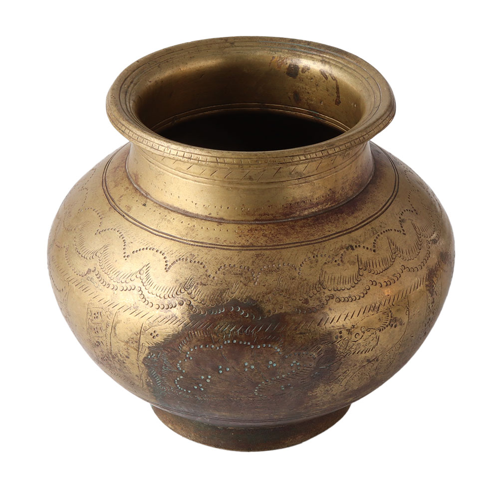 This antique pot is constructed of brass, and it has been hand carved to give it a distinctive and fashionable appearance. This distinctive type pot is ideal for adding a touch of old world charm to your living area. Ideal for holding flower arrangements or fresh herbs. Additionally, it can be displayed as art on a kitchen countertop. This pot, which the ancient Karigars expertly handcrafted and features lovely carvings, is ideal for your indoor or outdoor garden. It provides your home a special touch and a more contemporary appearance. A great option for food photography is our vintage "one of a kind" pot.