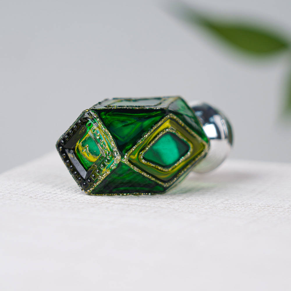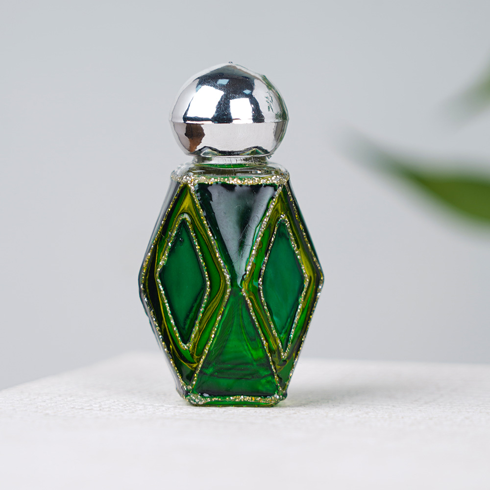 This stunning green glass bottle with sparkles carved in its surface is a masterpiece handmade by highly skilled Indian craftsmen. The bottle is a unique piece of art that features a silver-coloured knob used to close it, making it not only practical but also visually appealing. The bottle is perfect for use as a perfume or oil container, adding an elegant touch to your vanity or shelf. The beautiful design carved on the bottle makes it a perfect decorative item for your home. It can be placed on a table or shelf to create a captivating display, or it can be added to a collection of empty perfume bottles, mini perfume bottles, or unique perfume bottles. This exquisite bottle makes an ideal gift for your family, friends, or relatives on special or festive occasions. Its fine craftsmanship, coupled with its exceptional beauty, will make it a cherished gift for years to come. With its unique design and exceptional quality, this green glass bottle is a stunning addition to any collection or decor.