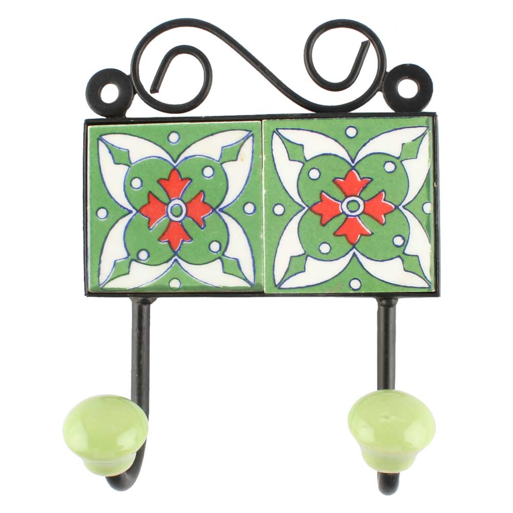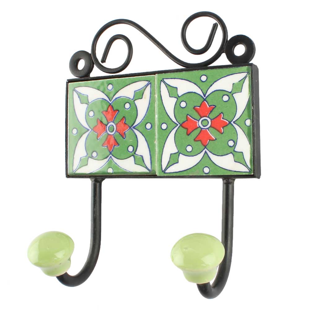 Green Floral Ceramic Tile Hook. When Put on Wall or Cabinet It is An Art in Itself. The Metal Part of this Hook is Black Powder Coated.