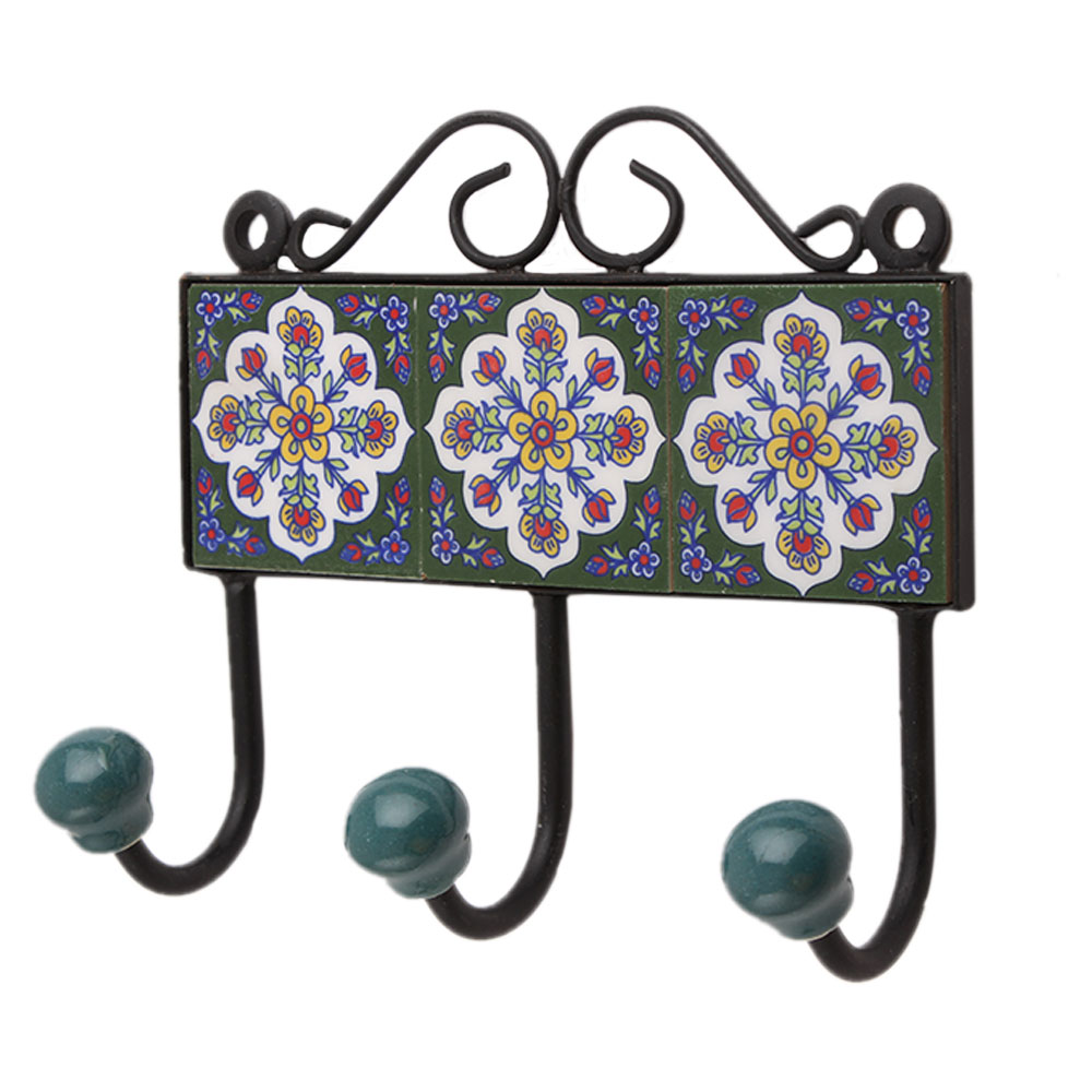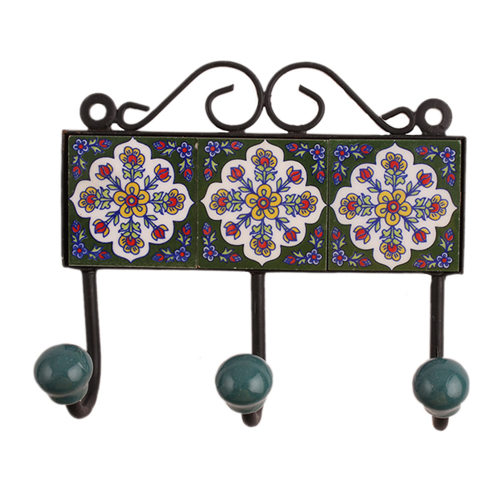 Green Floral Ceramic Tiles Hooks. When put on wall or cabinet it is an art in itself. The metal part of this hook is black powder coated.