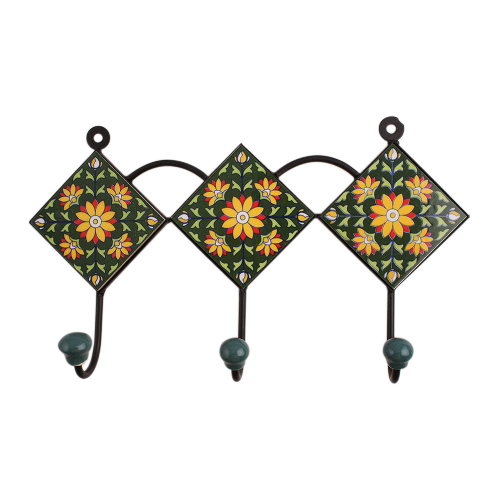 Green Floral Ceramic Tiles Hooks. When put on wall or cabinet it is an art in itself. The metal part of this hook is black powder coated.