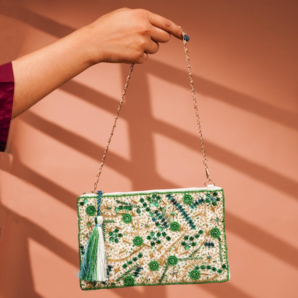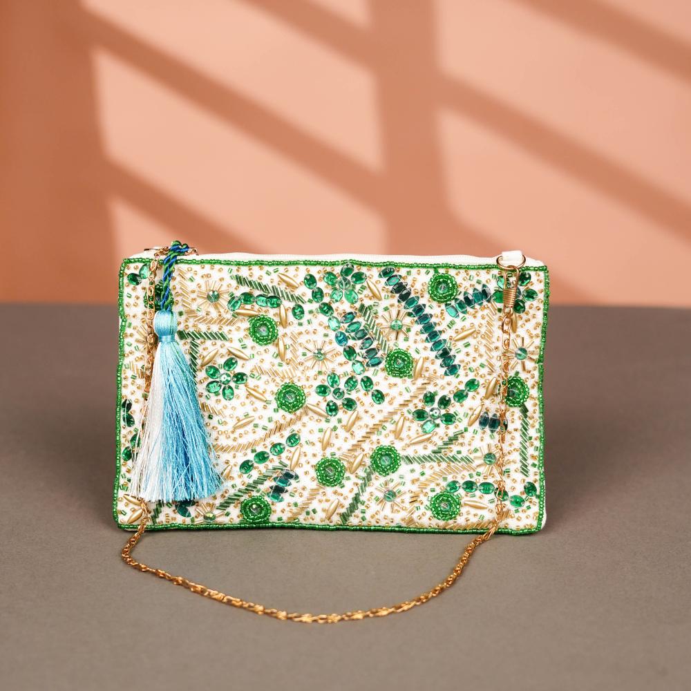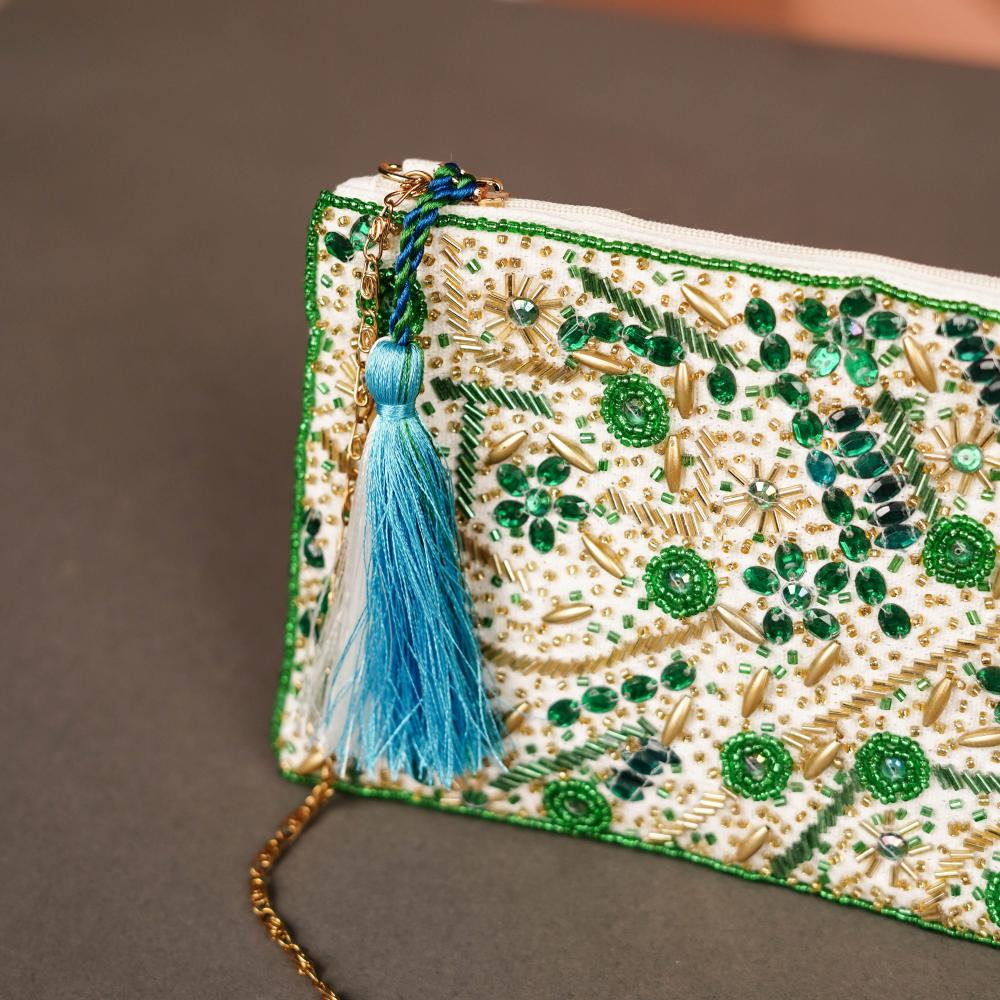 A celebration of earthy tones and delicate design, this cotton and bead handbag exudes timeless sophistication. The rich green beadwork, meticulously arranged on an ivory cotton base, evokes the freshness of spring meadows. Accentuated with a light blue tassel and finished with a sleek golden chain, this accessory blends subtle elegance with artisanal charm. Whether you're heading to a garden party or a brunch with friends, this handbag adds a graceful pop of texture and color to any ensemble.