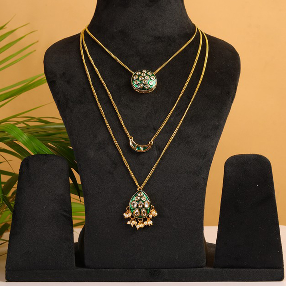 The Green Kundan Multi-Layer Necklace with Gold Tone Chains & Pearl Tassels is designed for occasions that demand presence and grace. Crafted in brass with a radiant golden finish, this 26-inch necklace features layered chains that cascade elegantly along the neckline. Vibrant green kundan stones add royal depth, while delicate pearl tassels introduce fluid movement and softness. The design blends heritage artistry with bold layering, making it ideal for wedding and festive styling.