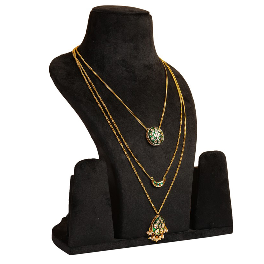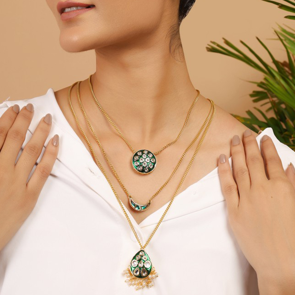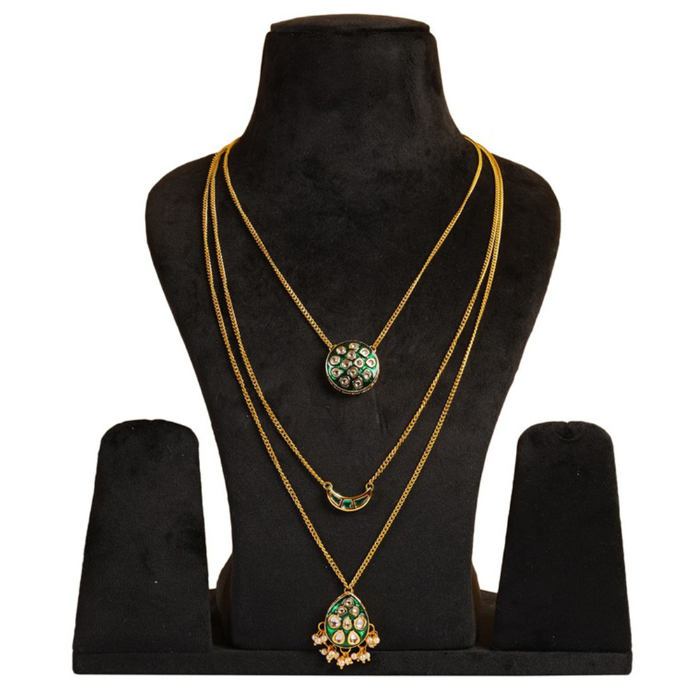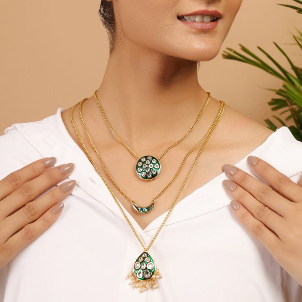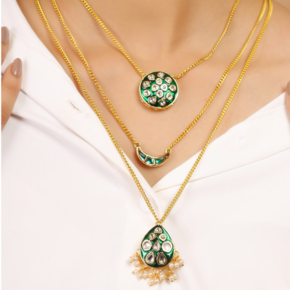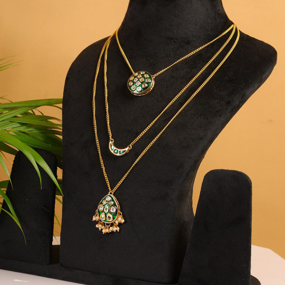Celebrate individuality with this Green Kundan Multi-Layer Necklace with Gold Tone Chains & Pearl Tassels. Featuring three layers of gold-tone chains adorned with unique pendants a circular pendant, a crescent pendant, and a teardrop pendant with pearl tassels each embellished with green and clear kundan stones, this statement piece is perfect for bridal ensembles, festive occasions, and meaningful gifting. Packed & quality-checked by Indianshelf.