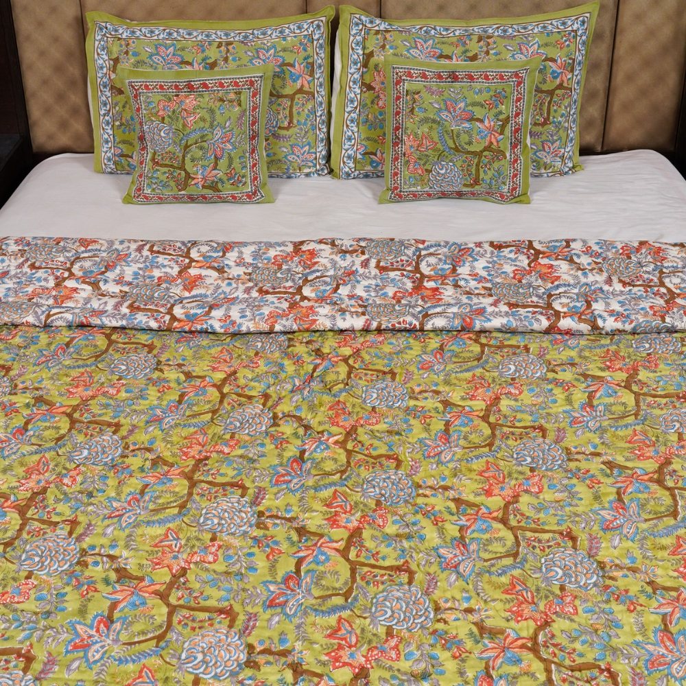 This multicolor Malmal (Voile) quilt showcases a vibrant symphony of floral block prints in green, red, and blue hues. Crafted from fine cotton voile, it offers an airy, soft texture perfect for year-round comfort. Expertly handmade and quality-checked by Indianshelf, it combines traditional Indian craftsmanship with modern elegance.