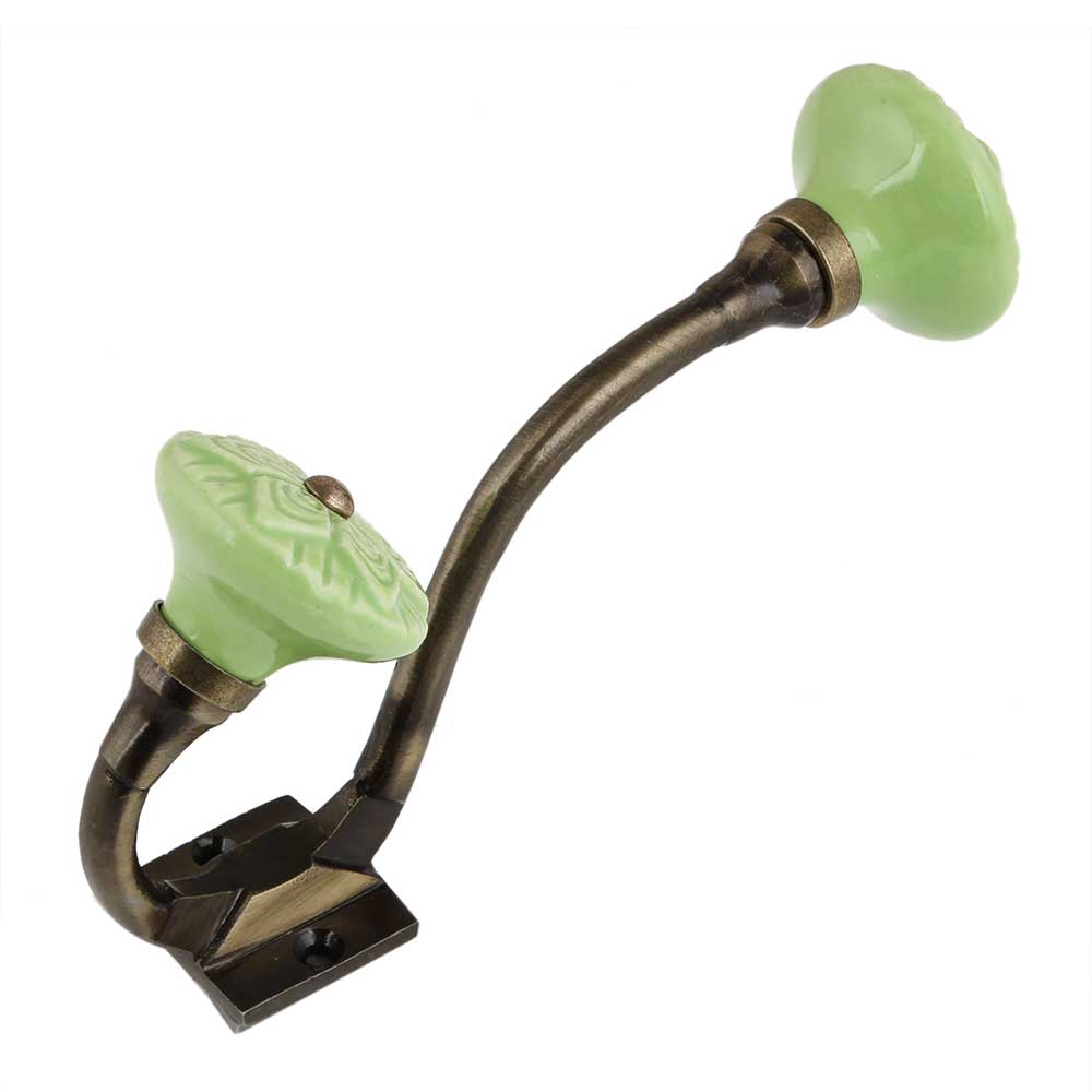 Material: Glazed ceramic with antique iron hook base Finish: Hand-painted ceramic with distressed iron patina Installation: Wall-mounted with hidden screws