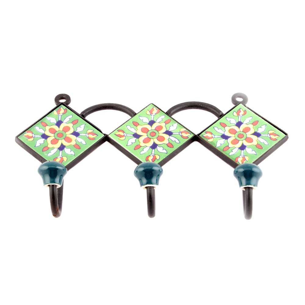 Green Yellow Flower Tiles Hooks. When Put on Wall or Cabinet it is an Art in itself. The Metal Part of this Hook is Black Powder Coated.