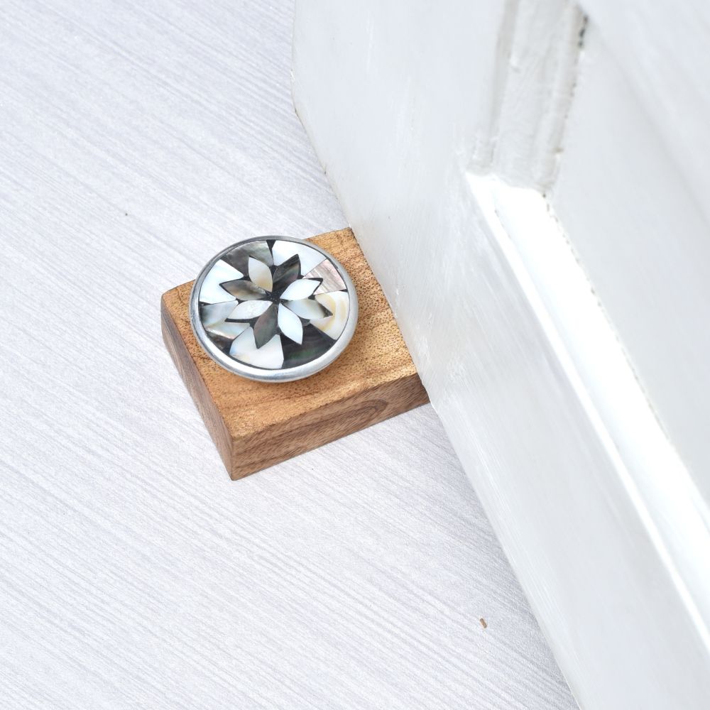 A Wooden Door Stopper which is a perfect blend of elegance and functionality. Crafted meticulously from high-quality wood, this door stopper boasts a timeless antique brown finish that adds a touch of sophistication to any space. What truly sets it apart is the exquisite mother of pearl engraving featuring a stunning grey and white coloured flower design, showcasing the artistic brilliance of skilled Indian artisans. Designed to serve its purpose flawlessly, this door stopper is not only a beautiful decorative piece but also highly practical. Its sturdy construction ensures reliable door holding, while the rubber grip beneath guarantees a secure placement without any slipping. With its impeccable craftsmanship and thoughtful details, it makes an ideal gift for your loved ones on special occasions like housewarmings, symbolizing warmth and protection in their new abode.