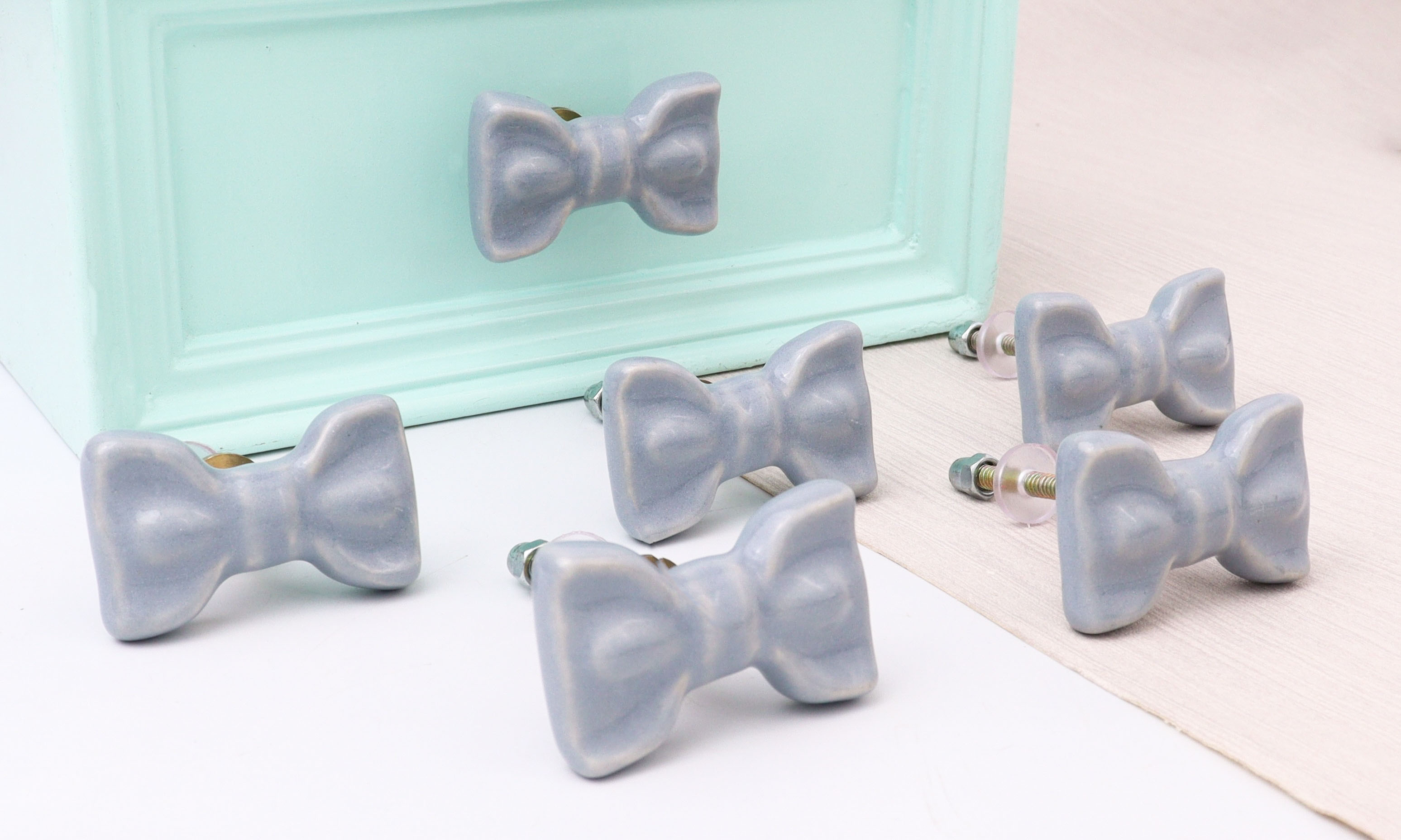 The Grey Ceramic Bow Cabinet Knob brings an element of refinement to your furniture. Whether it's a sleek modern dresser or a traditional cabinet, the subtle grey color and elegant bow shape elevate the look of any piece. This knob is a simple way to refresh your furniture, adding a touch of charm without overwhelming your space. It’s the ideal accessory for those who appreciate understated elegance in their home décor.